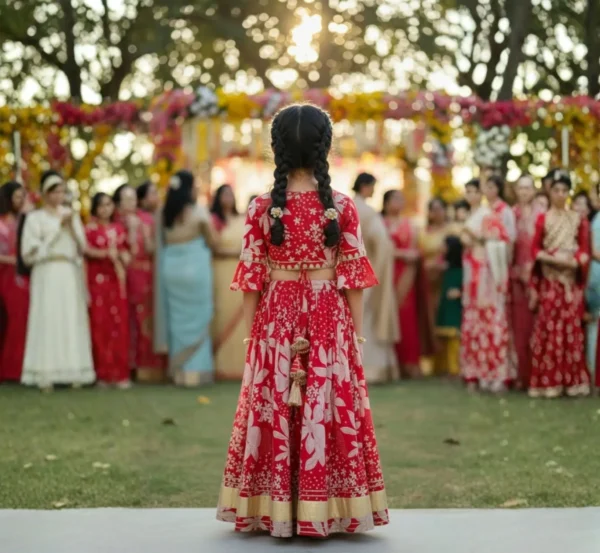 Elegant Girls Lehenga Choli in a vibrant Rani color, crafted from soft and breathable cotton fabric for all-day comfort. Perfect for festive occasions and celebrations, this beautiful ethnic outfit is available in sizes 3–4 and 4–5 years.