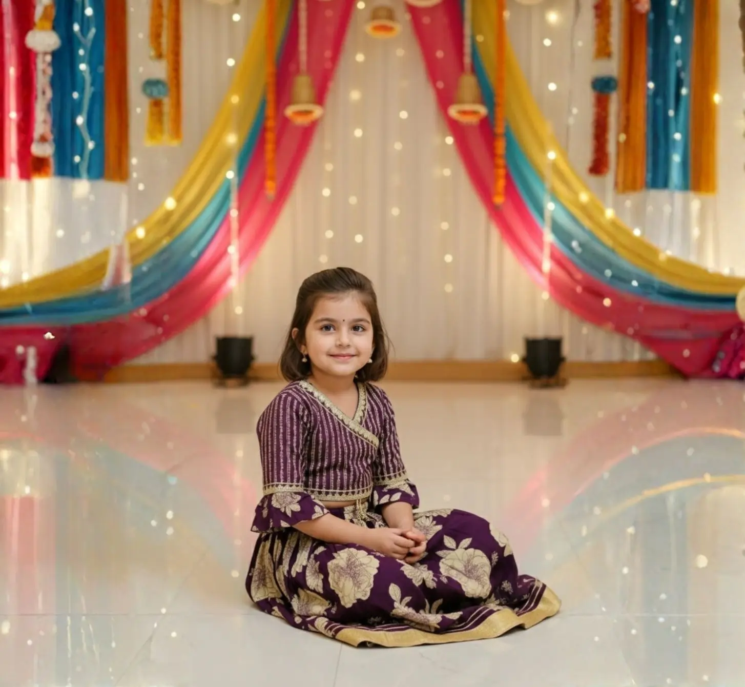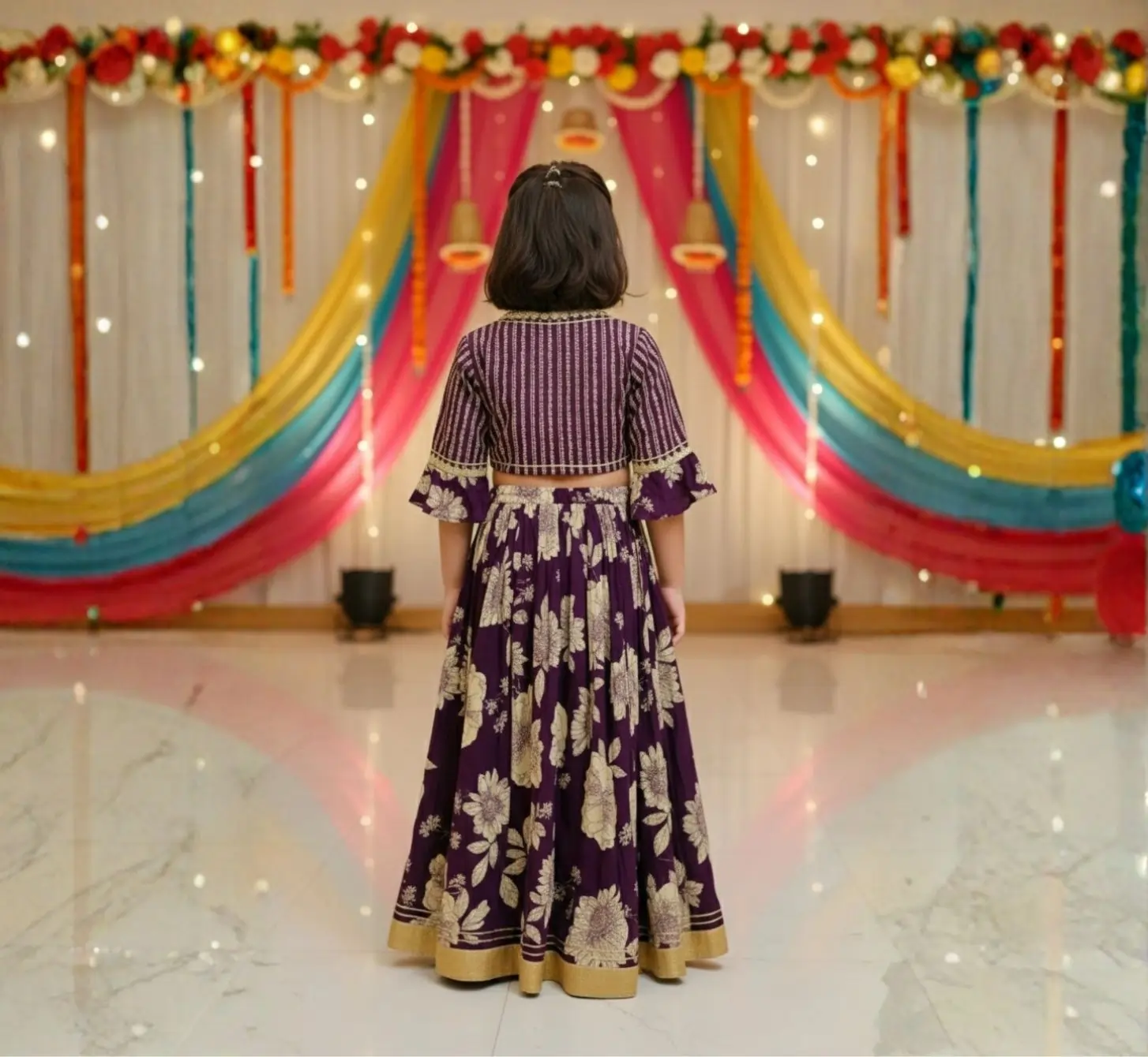 Graceful Girls Lehenga Choli in a rich Purple shade, made from soft and breathable cotton fabric for maximum comfort. Perfect for festive occasions, weddings, and traditional celebrations, this elegant ethnic outfit is available in sizes 2–10 years for a perfect fit.