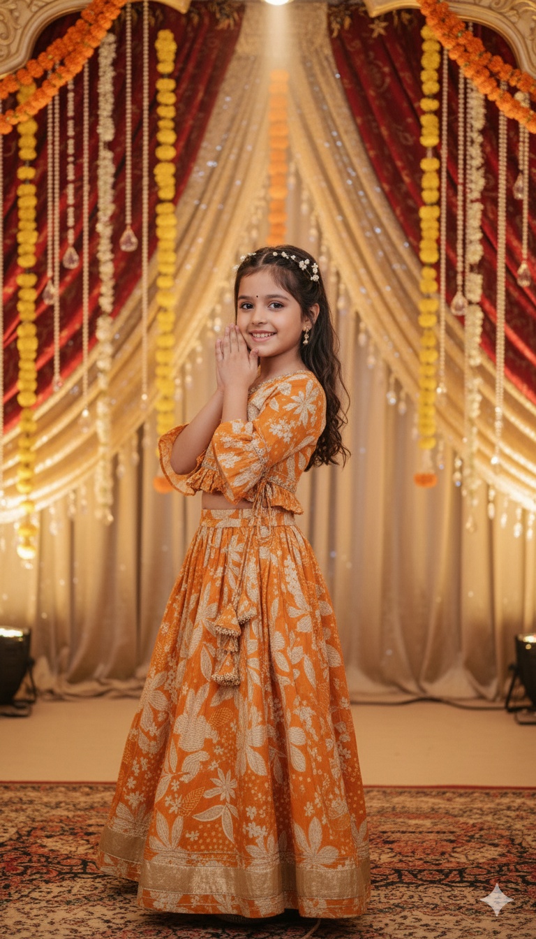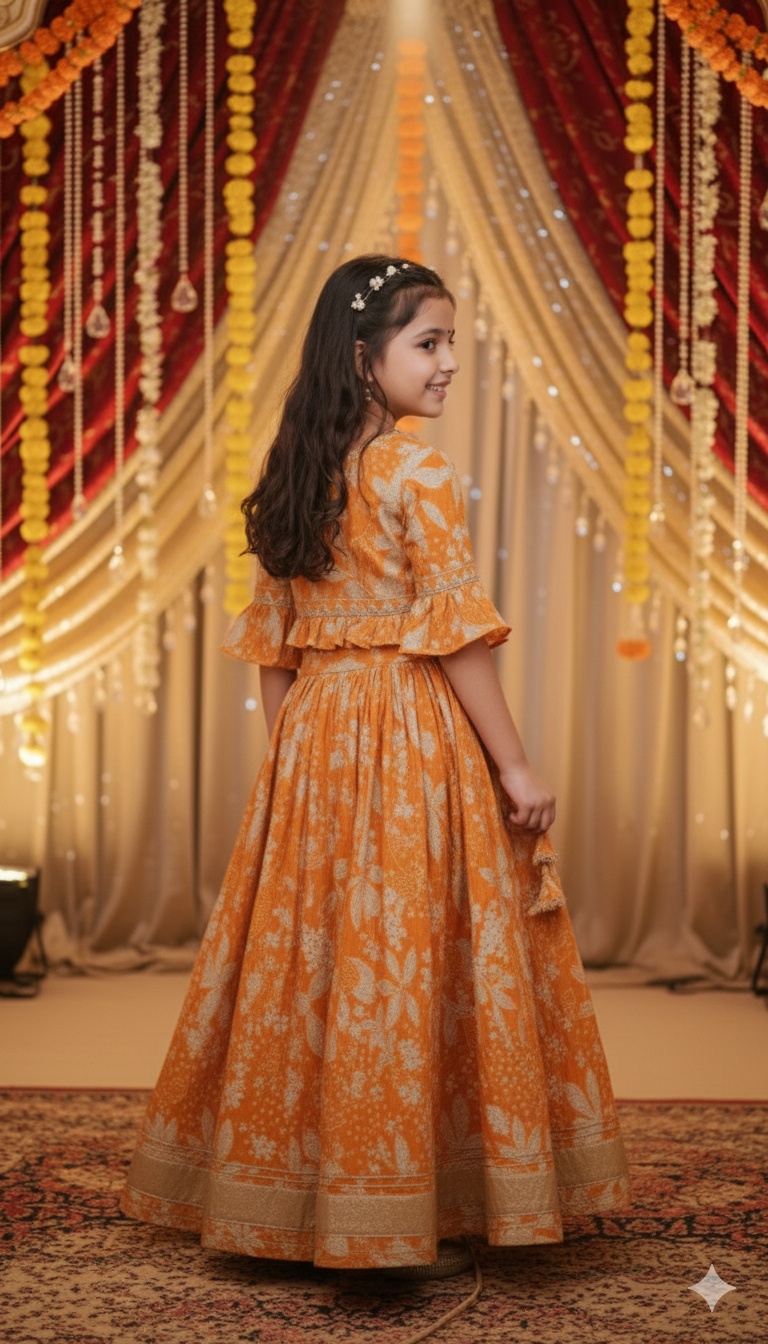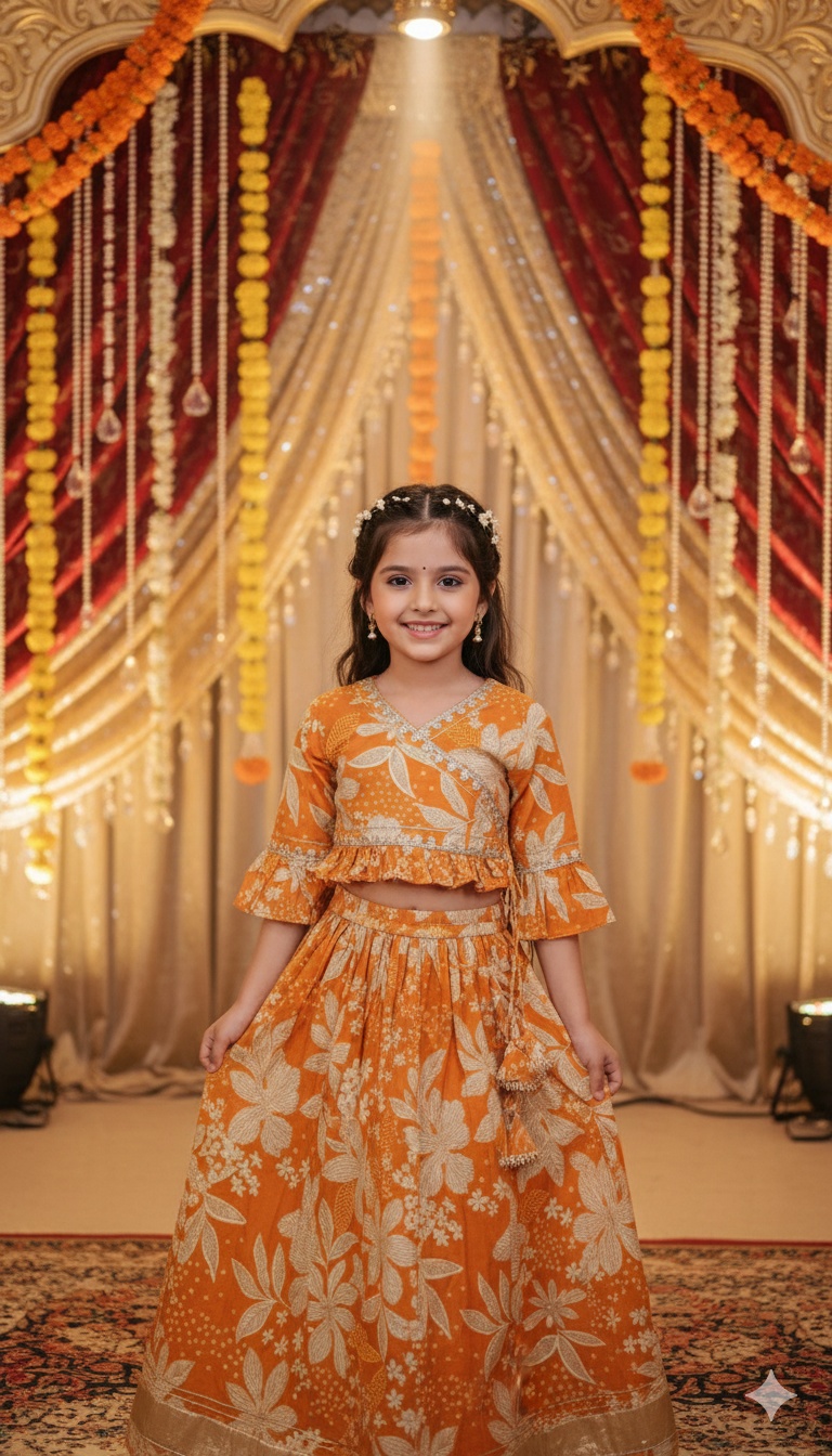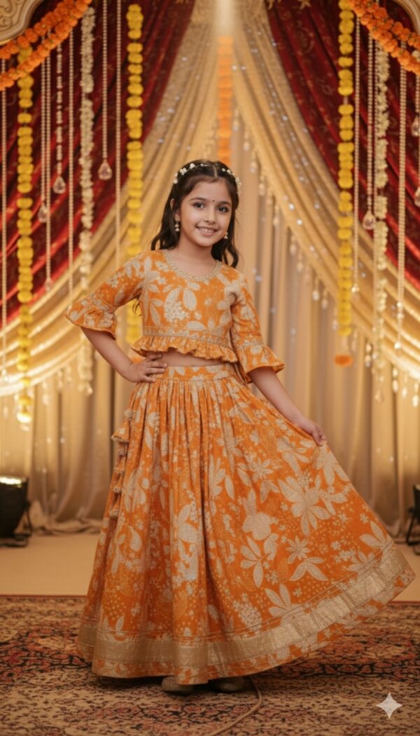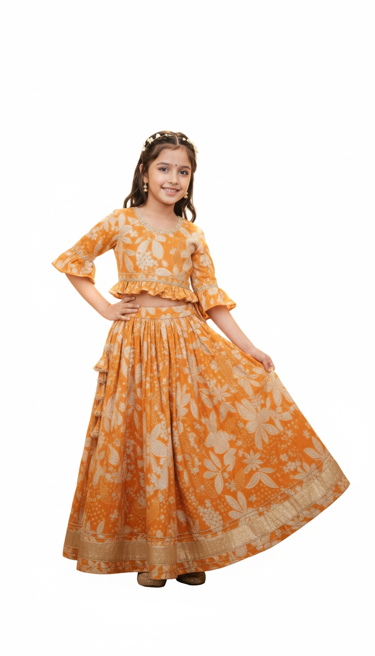 Elegant Girls Lehenga Choli made from soft and comfortable cotton fabric, perfect for festive celebrations and traditional occasions. Designed in a beautiful mustard color with a classic lehenga choli pattern, it ensures both style and ease of wear.