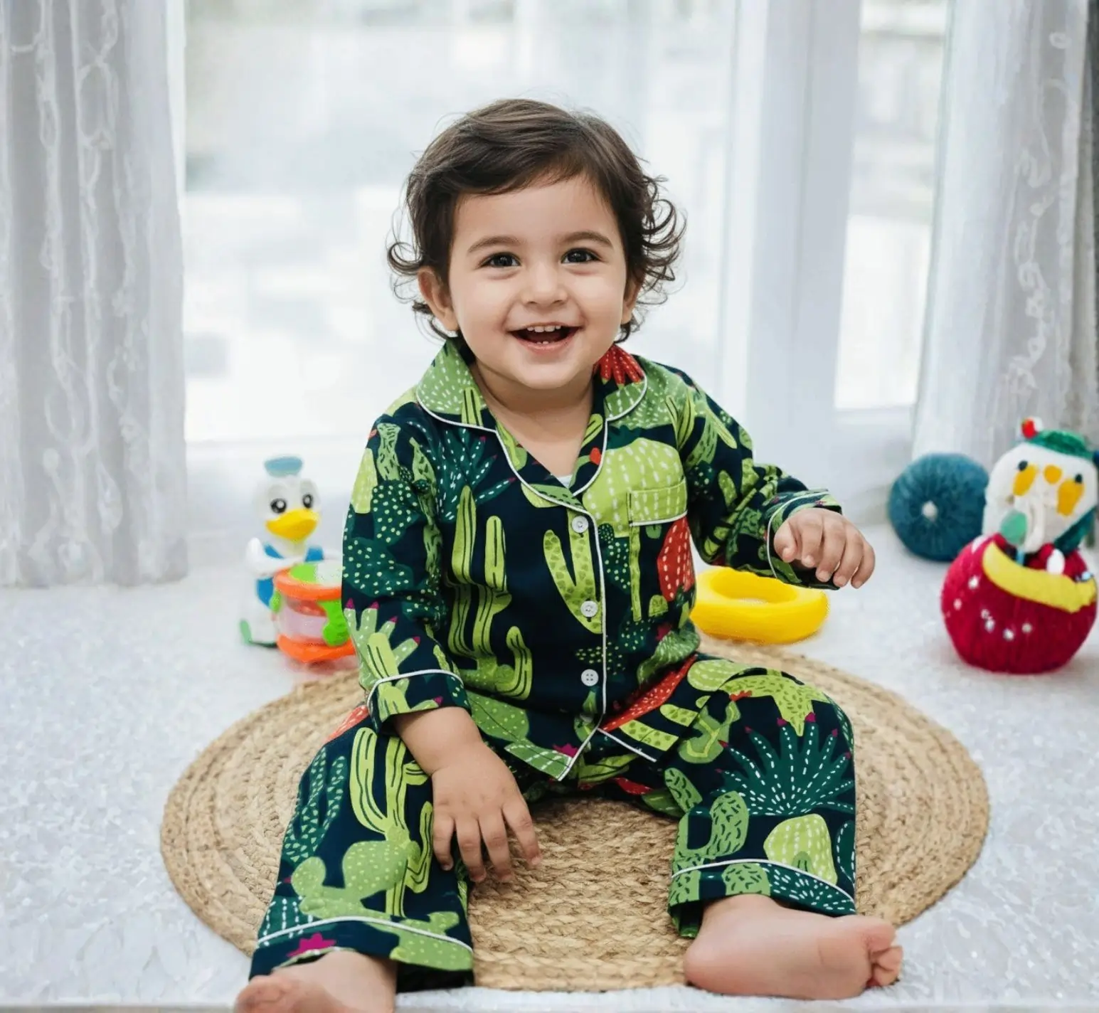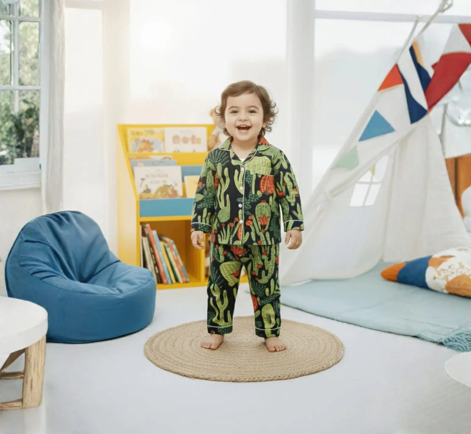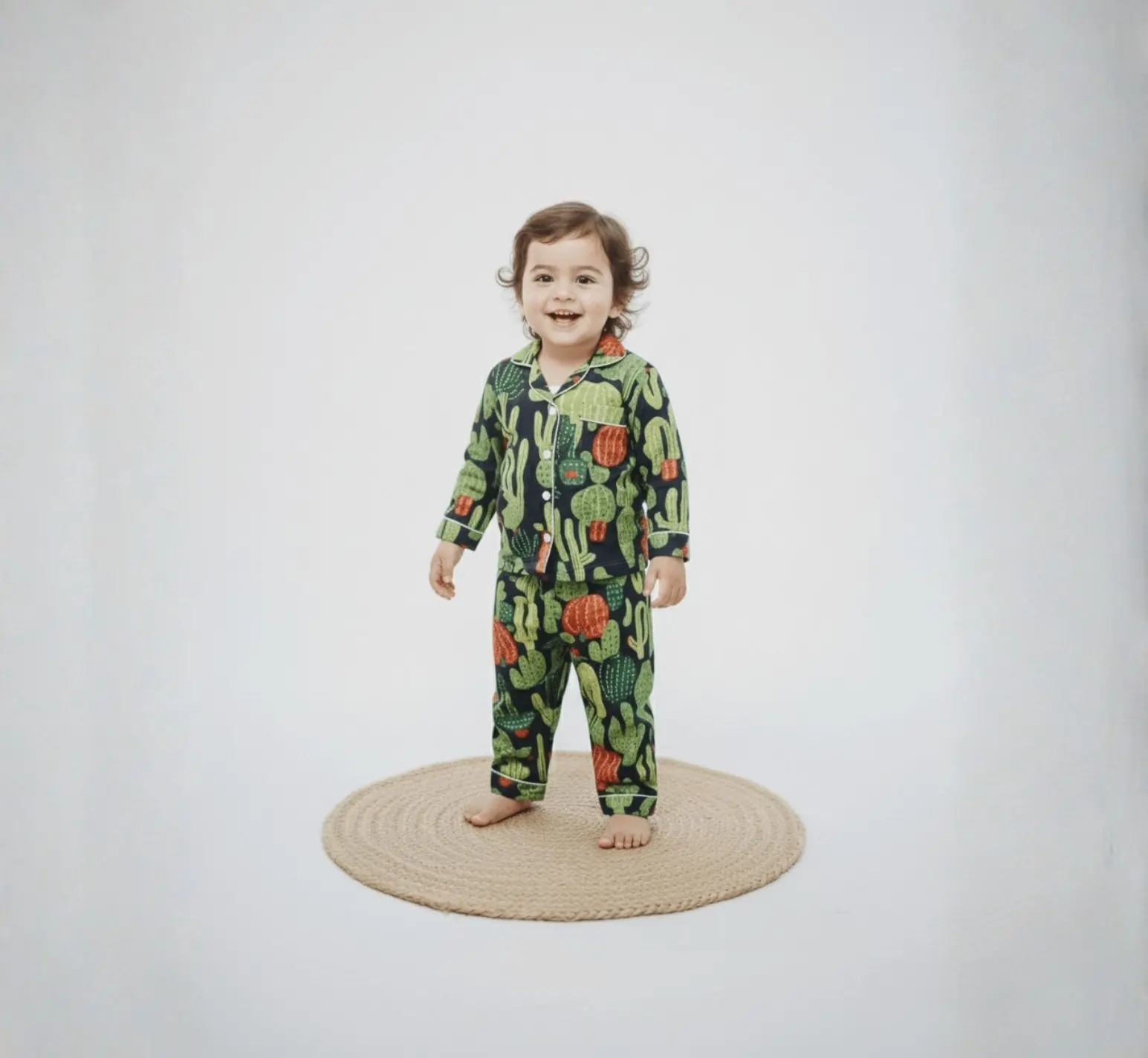 This kids black cactus night suit is made from soft pure cotton to keep your child comfortable all night long. Designed with full sleeves and a modern screen print, it feels gentle on the skin and allows easy movement. A cozy and stylish choice for everyday nightwear.