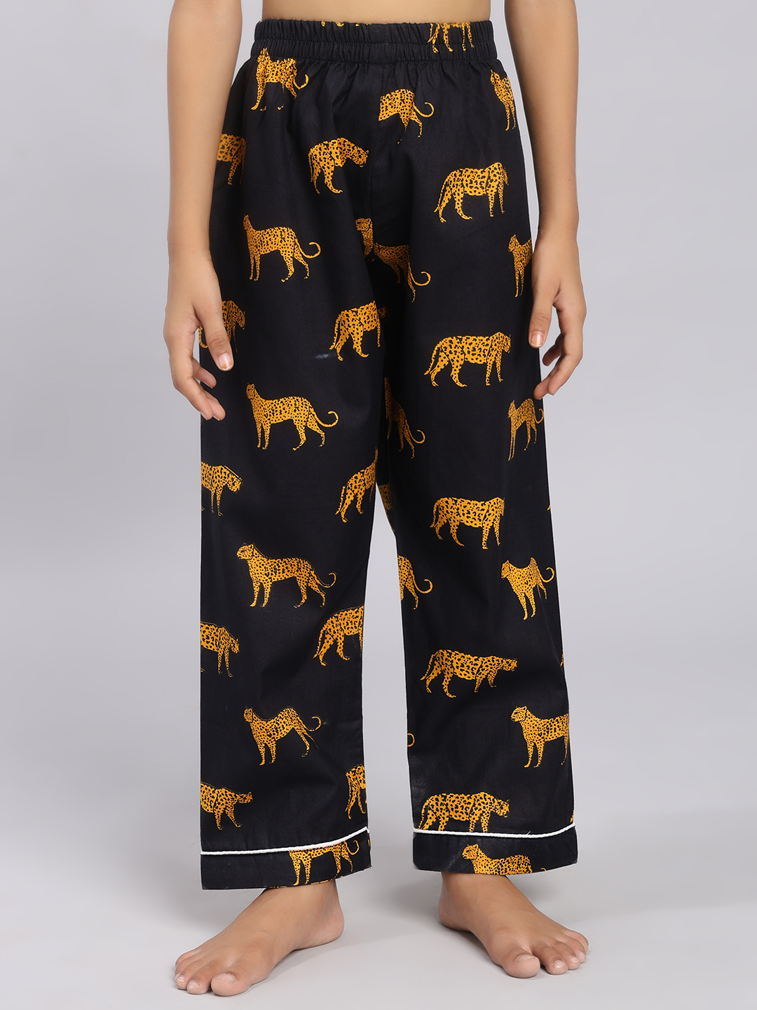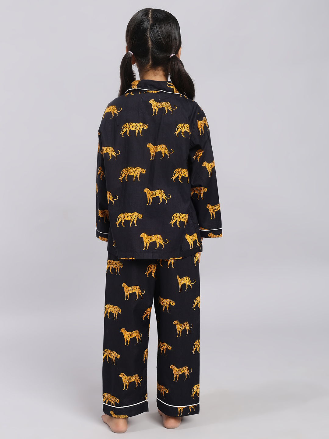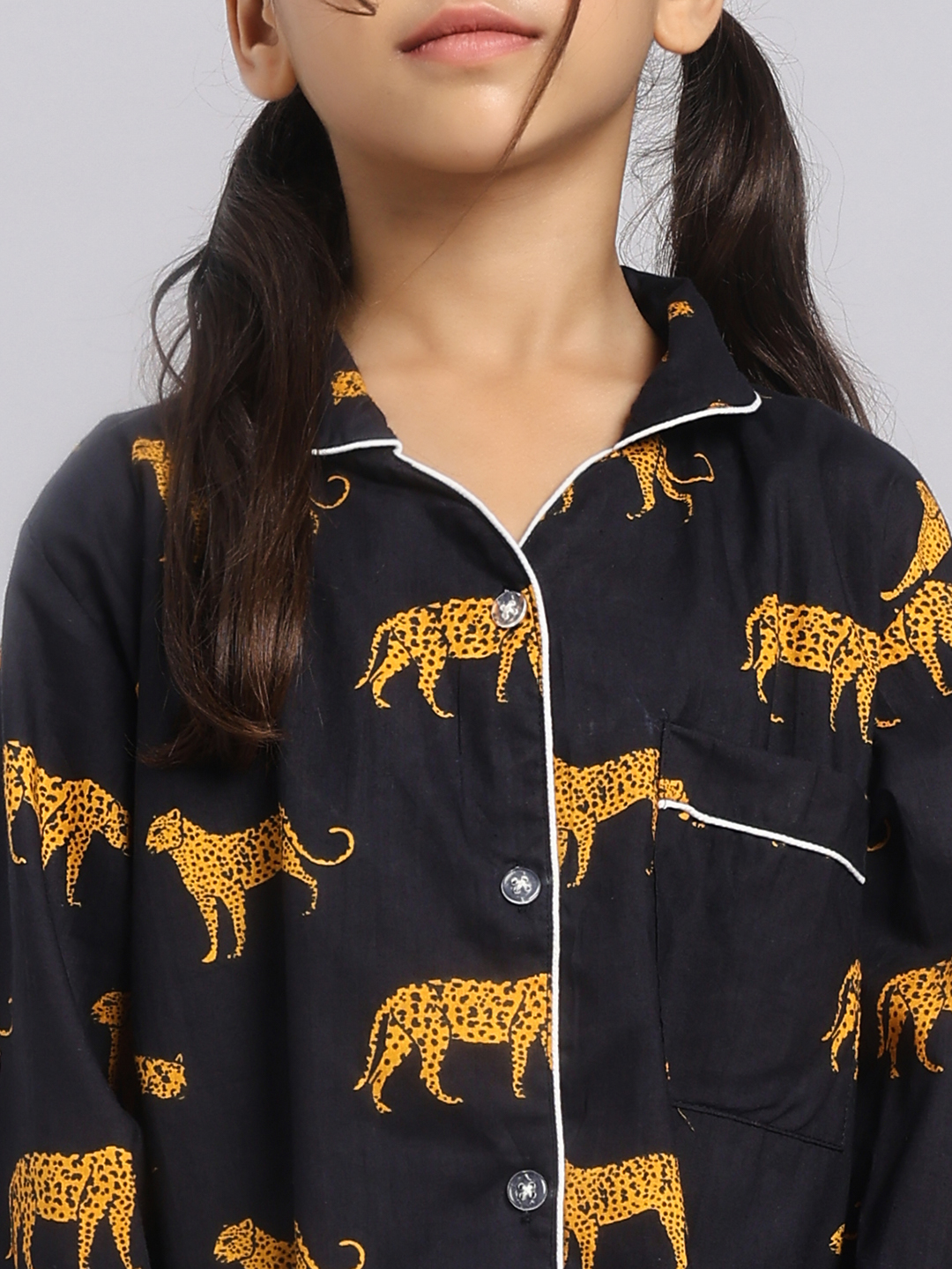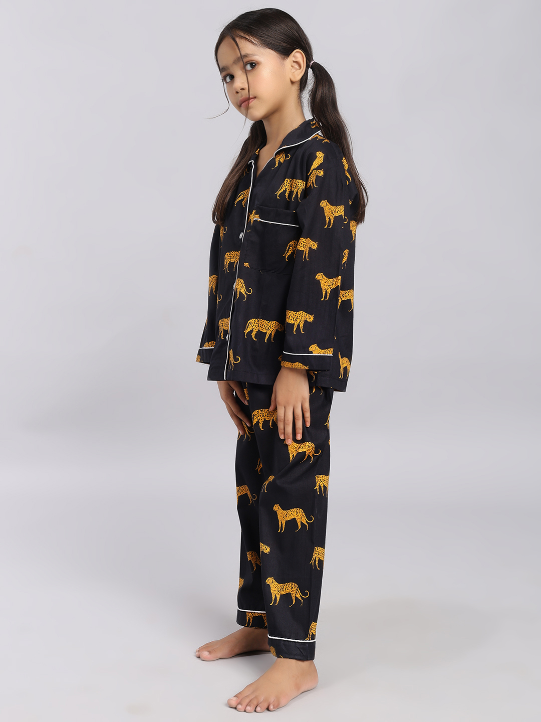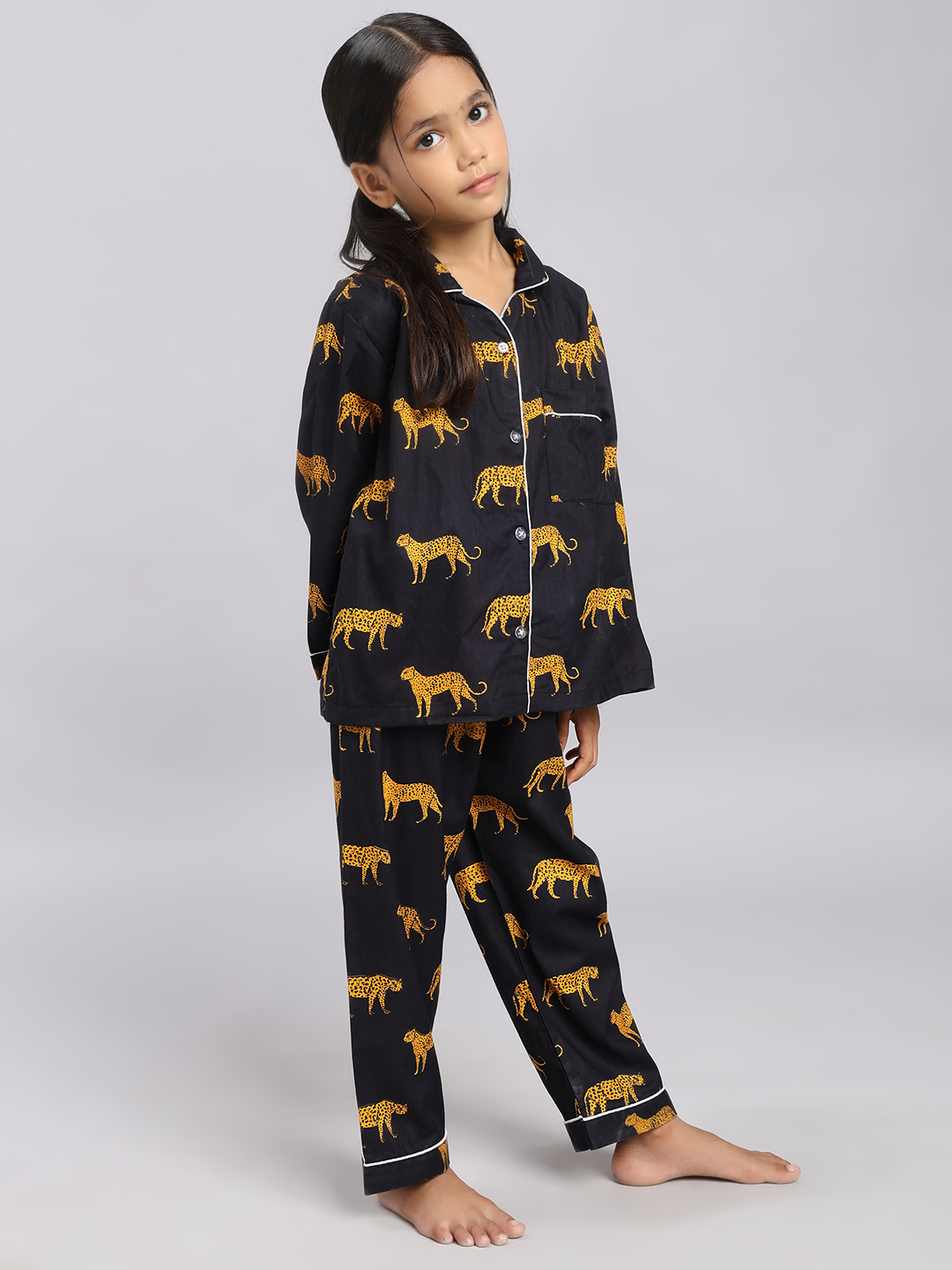 This kids black tiger print night suit is crafted from soft and breathable pure cotton for all-night comfort. Designed with full sleeves and a bold screen print, it feels gentle on the skin and allows easy movement. A cozy and stylish choice for everyday bedtime wear.