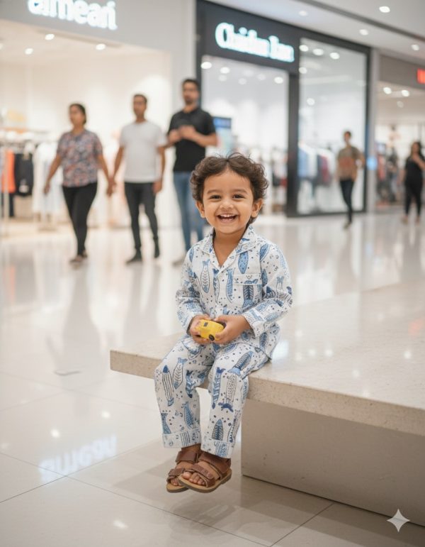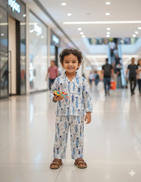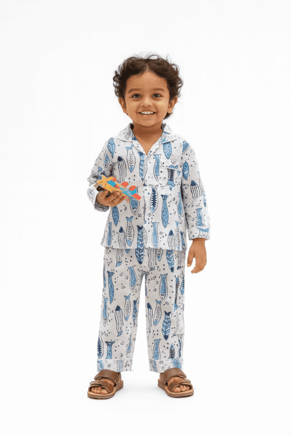 This kids blue fish night suit is crafted from pure cotton to provide a soft, breathable, and comfortable feel. Featuring full sleeves and a playful block print, it is gentle on the skin and perfect for a good night’s sleep. Ideal for everyday nightwear and relaxed lounging at home.