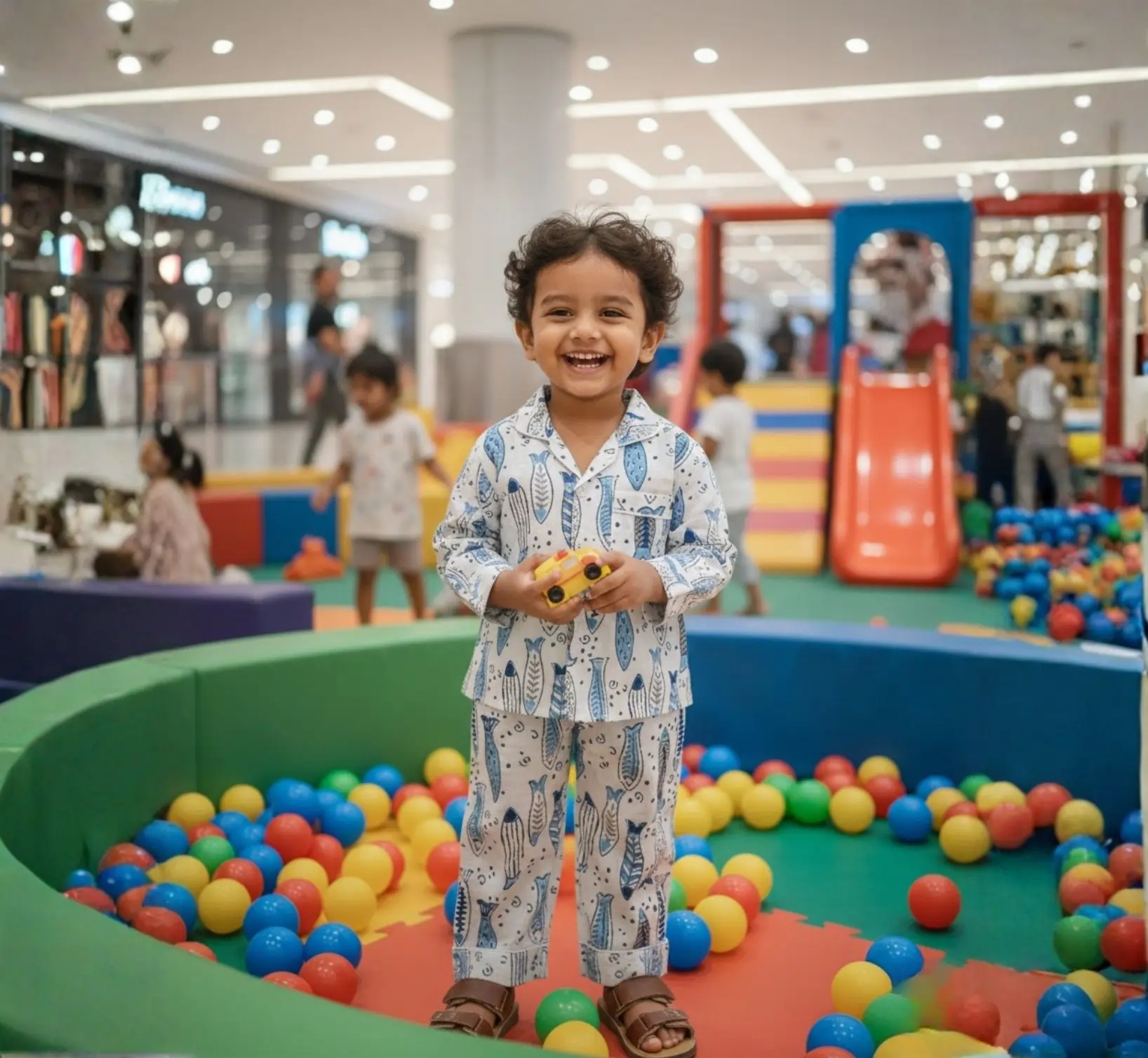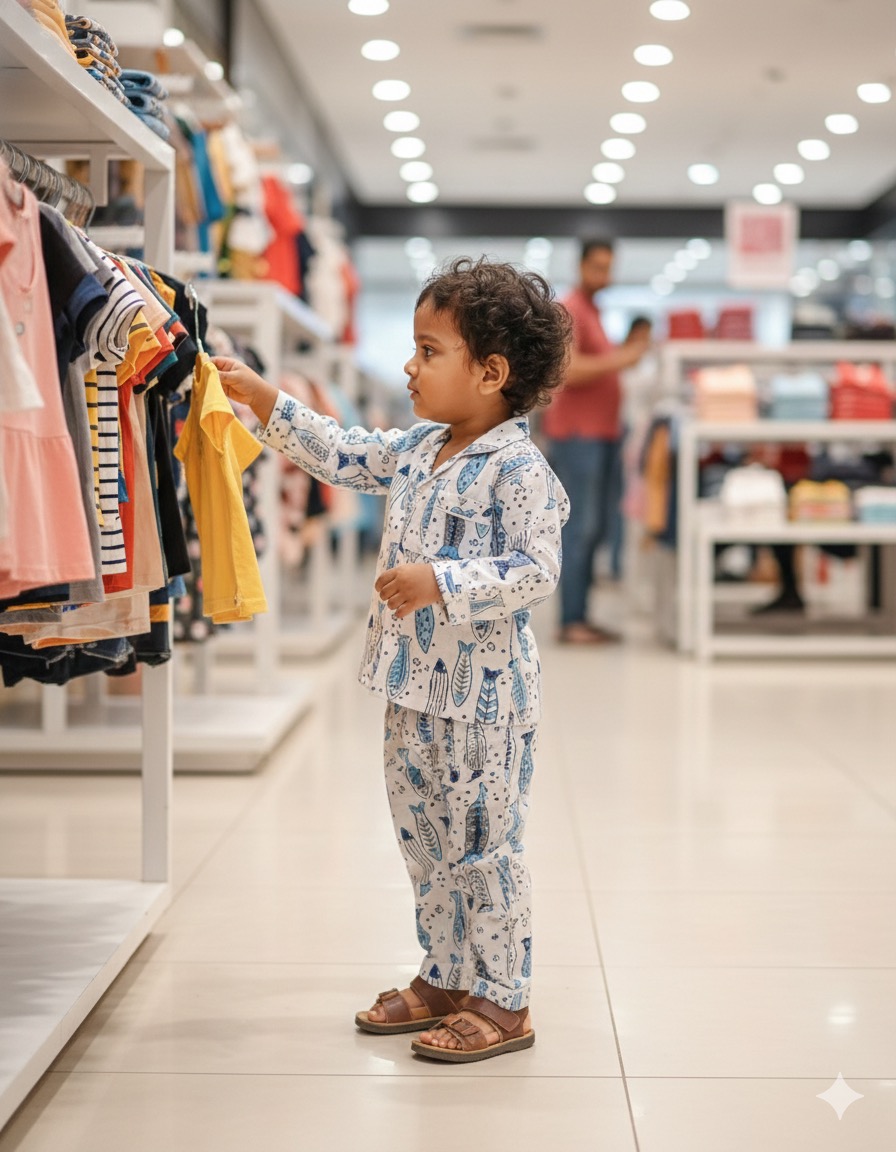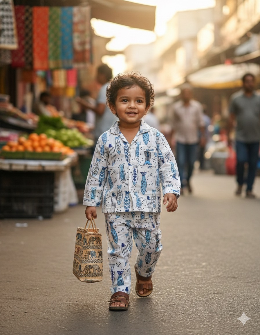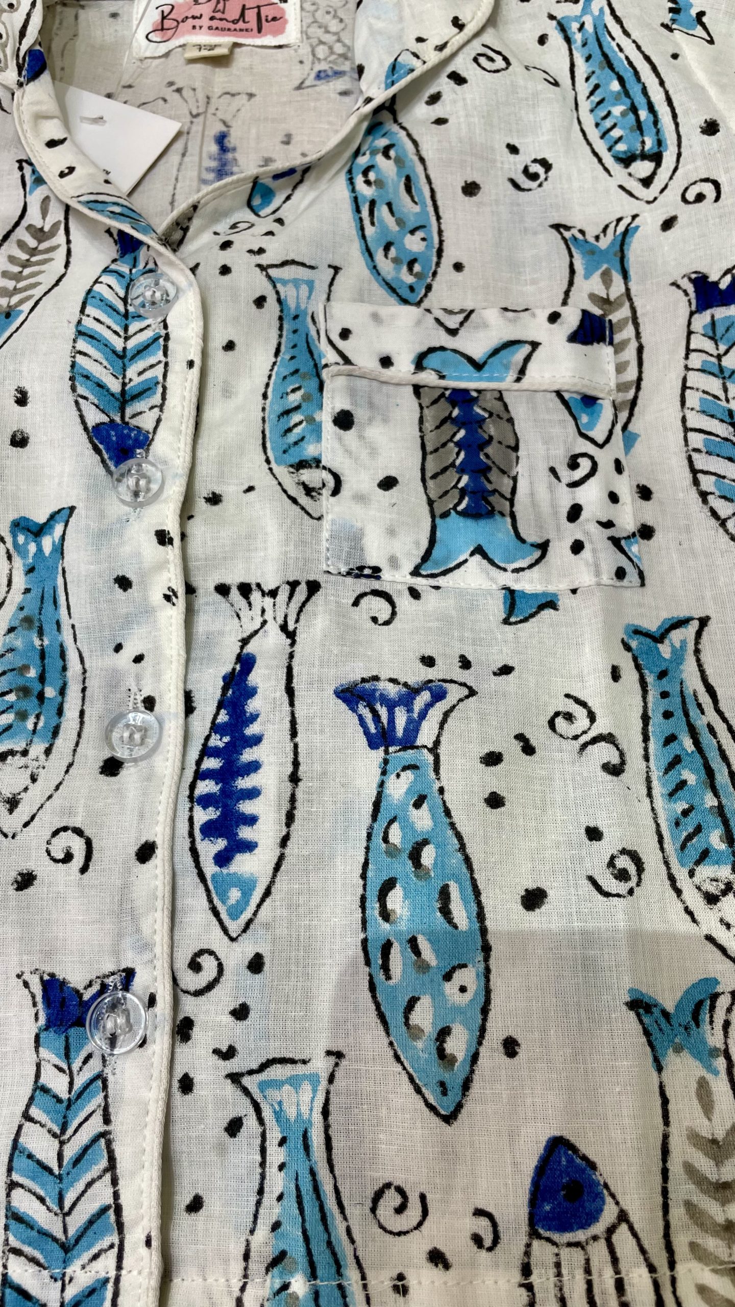 This kids blue fish night suit is crafted from pure cotton to provide a soft, breathable, and comfortable feel. Featuring full sleeves and a playful block print, it is gentle on the skin and perfect for a good night’s sleep. Ideal for everyday nightwear and relaxed lounging at home.