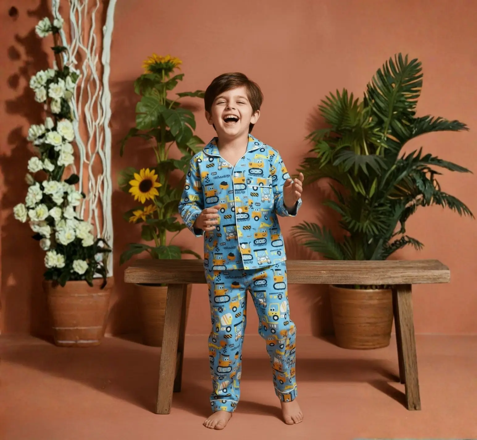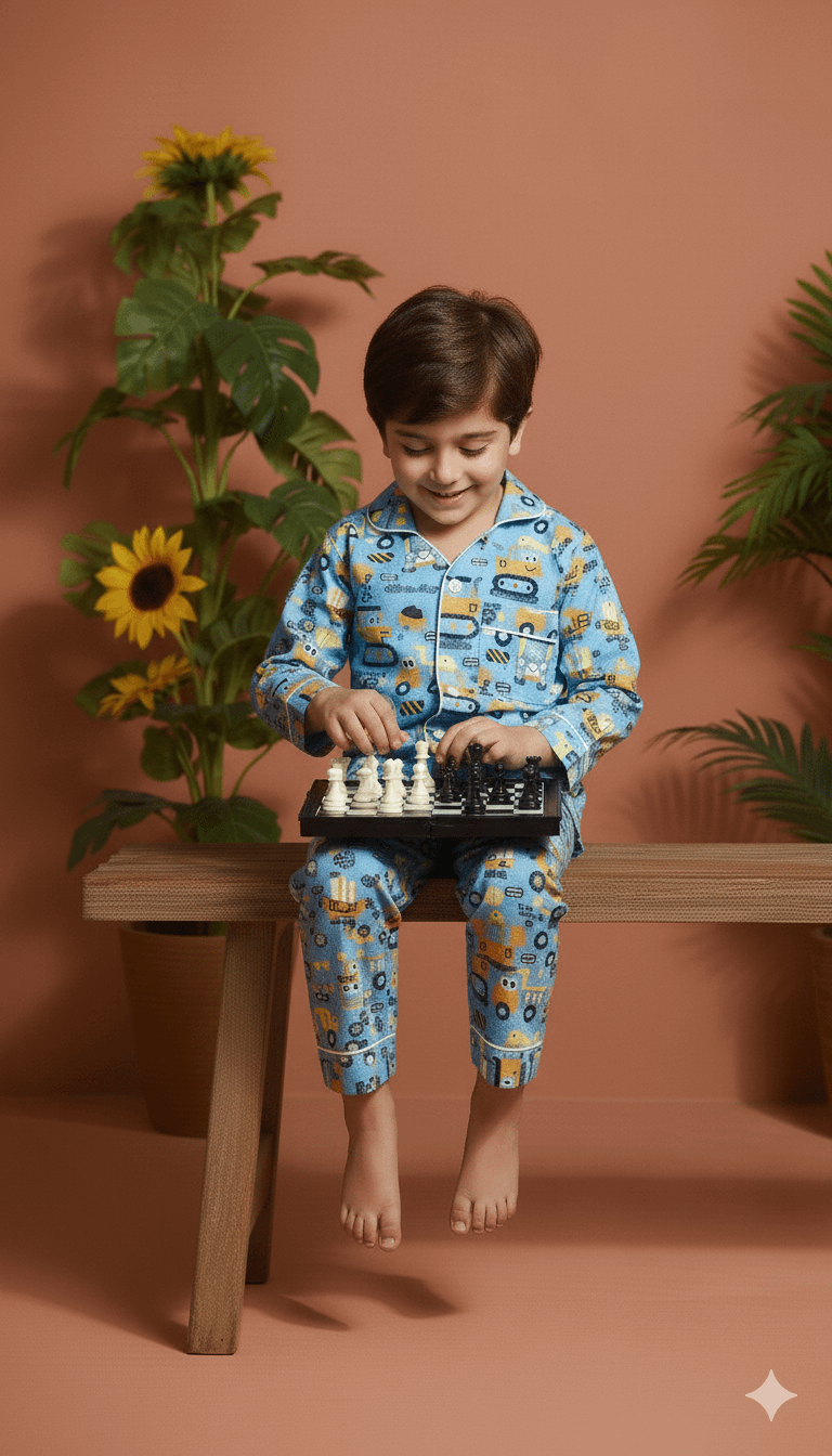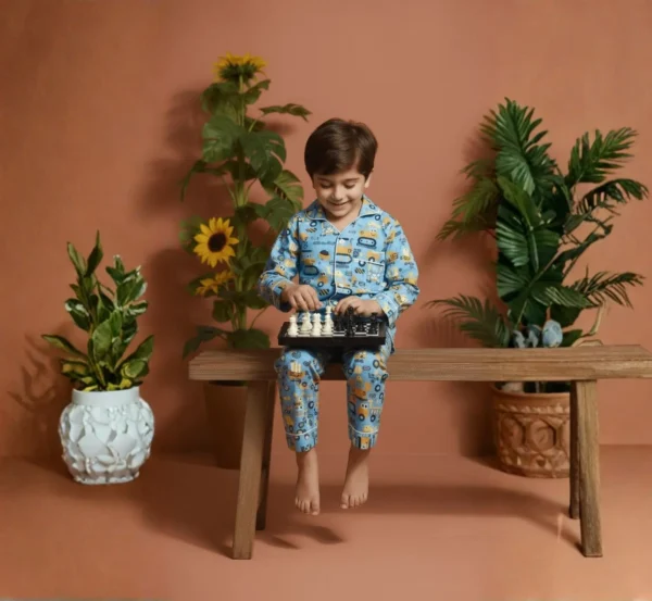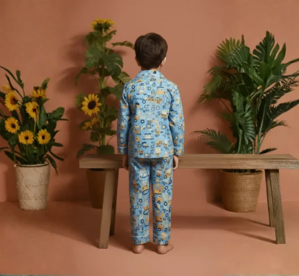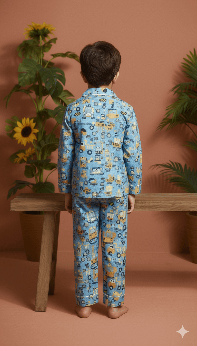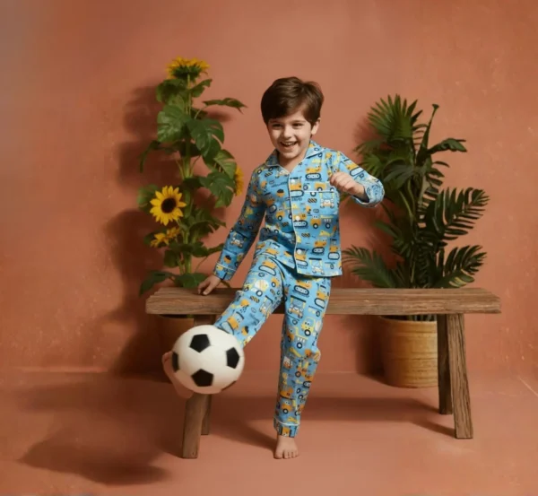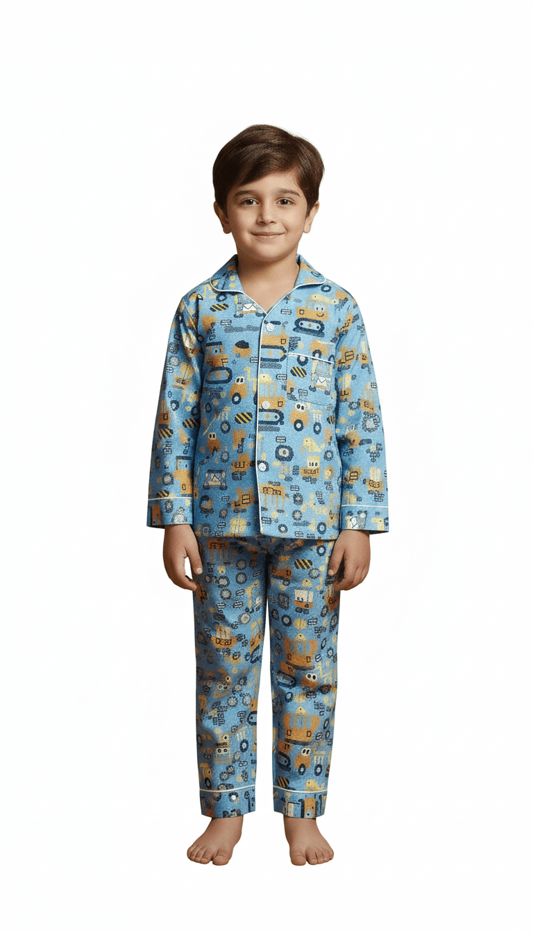 This kids blue truck night suit is made from soft pure cotton to ensure a comfortable and breathable feel. Featuring full sleeves and a fun screen print, it is gentle on the skin and perfect for cozy sleep. A playful and practical choice for everyday nightwear.