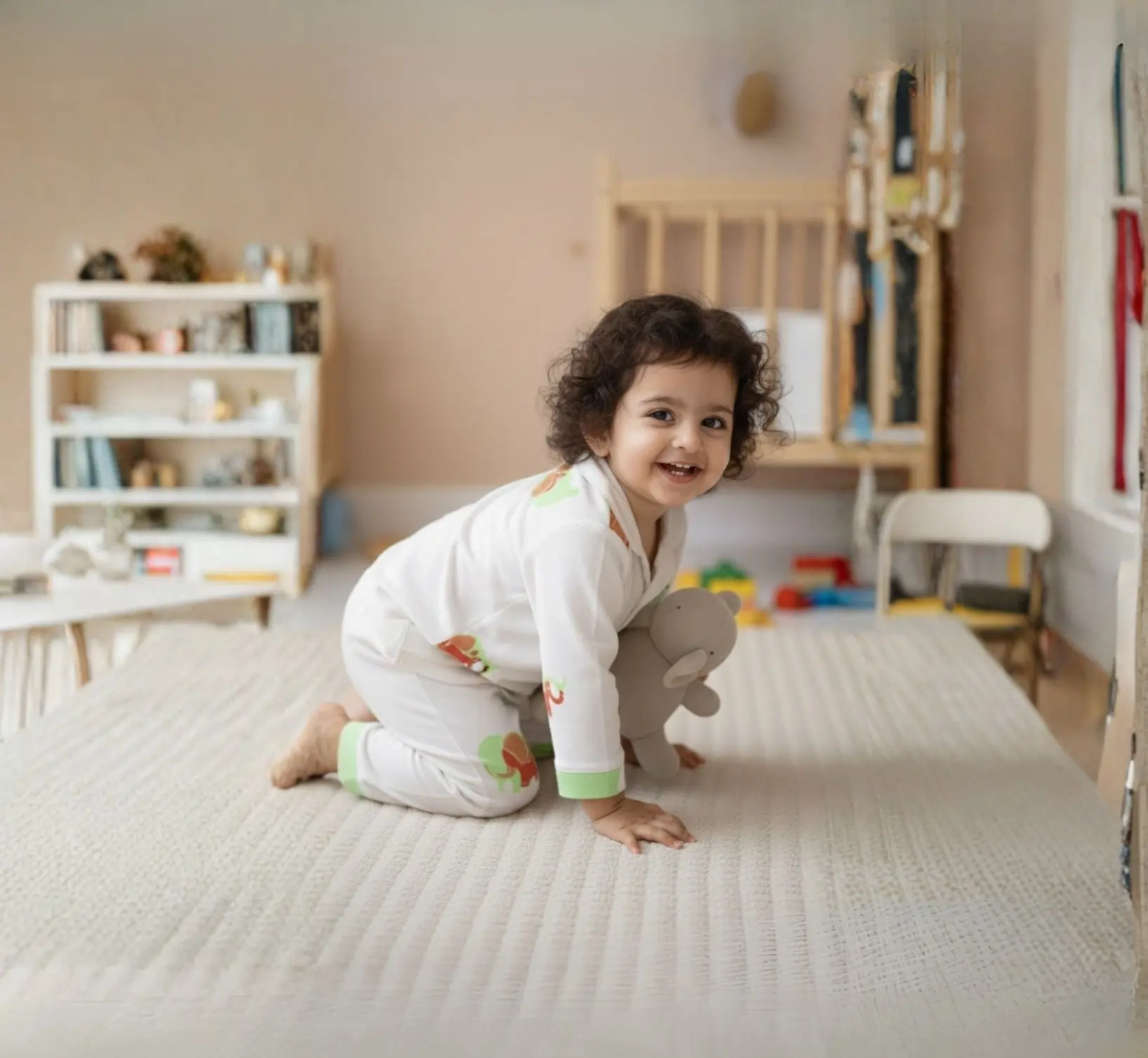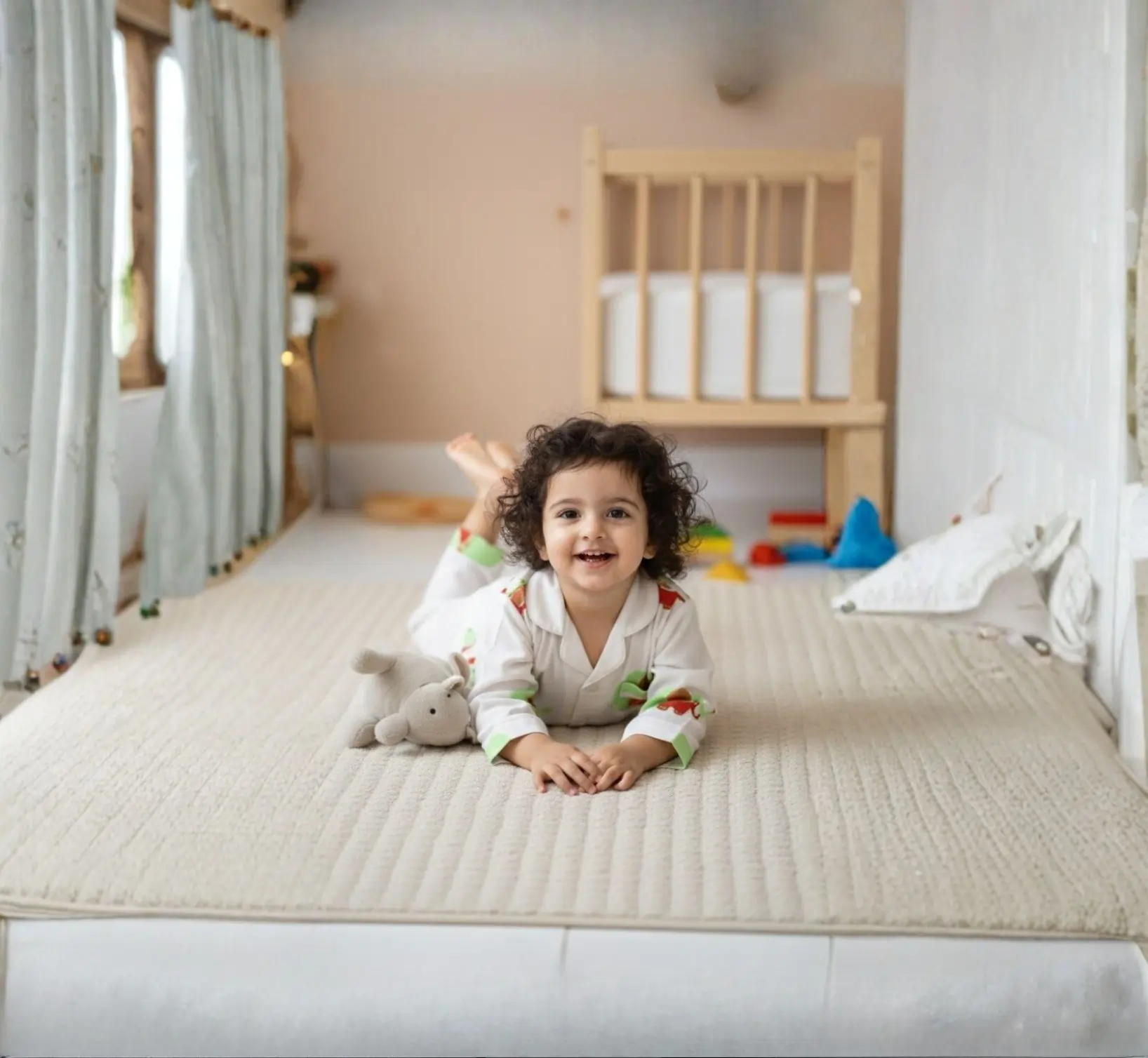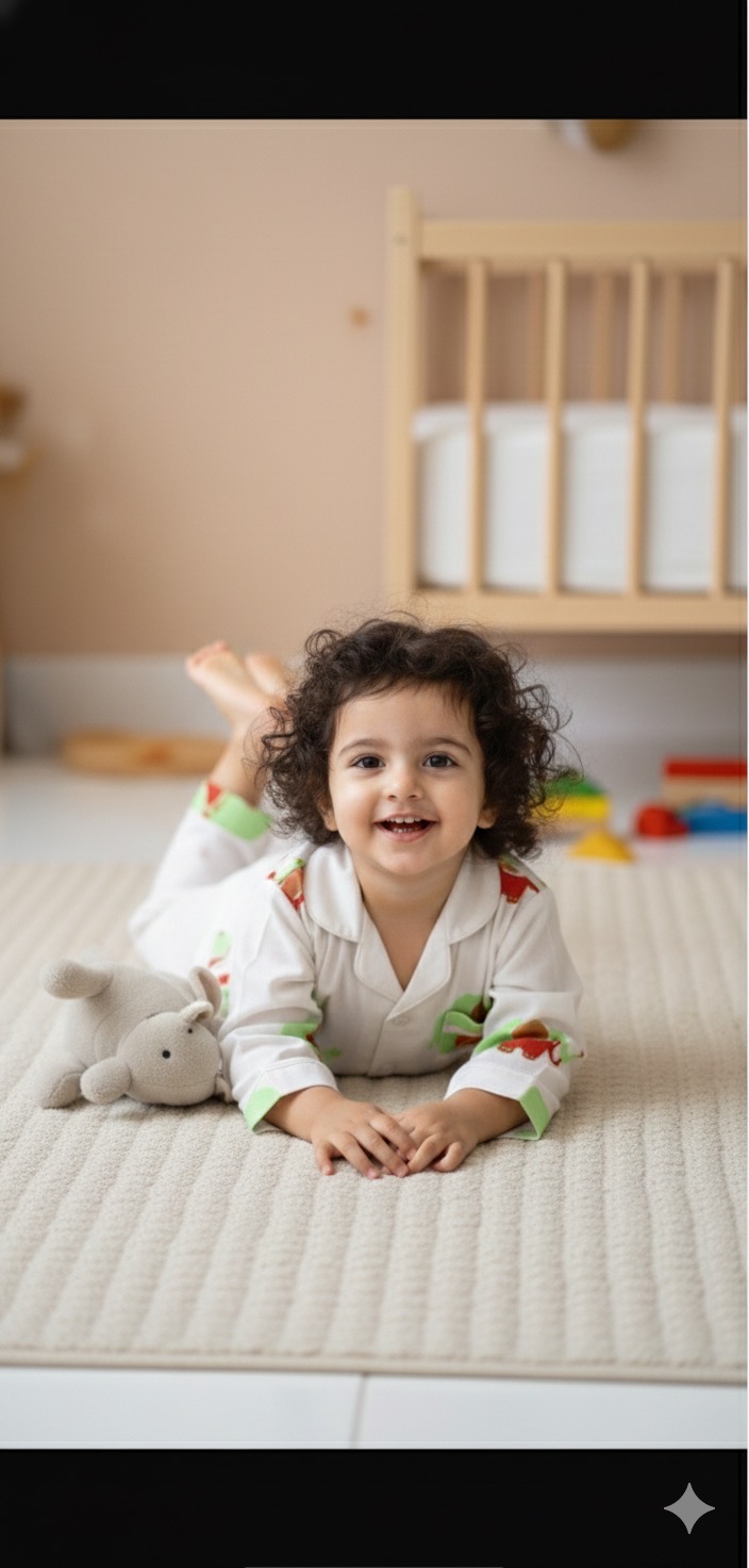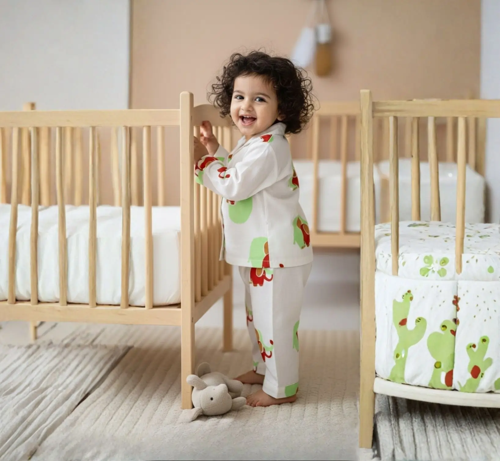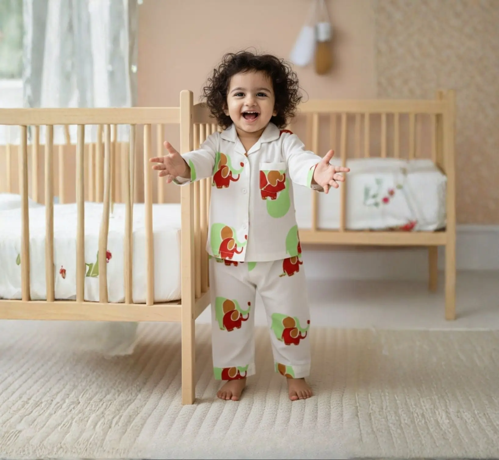 This kids green elephant night suit is made from soft pure cotton for all-night comfort. Designed with full sleeves and a playful block print, it feels gentle on the skin and allows easy movement. Perfect for bedtime and relaxed lounging, it keeps kids comfortable while adding a fun touch to their sleepwear.
