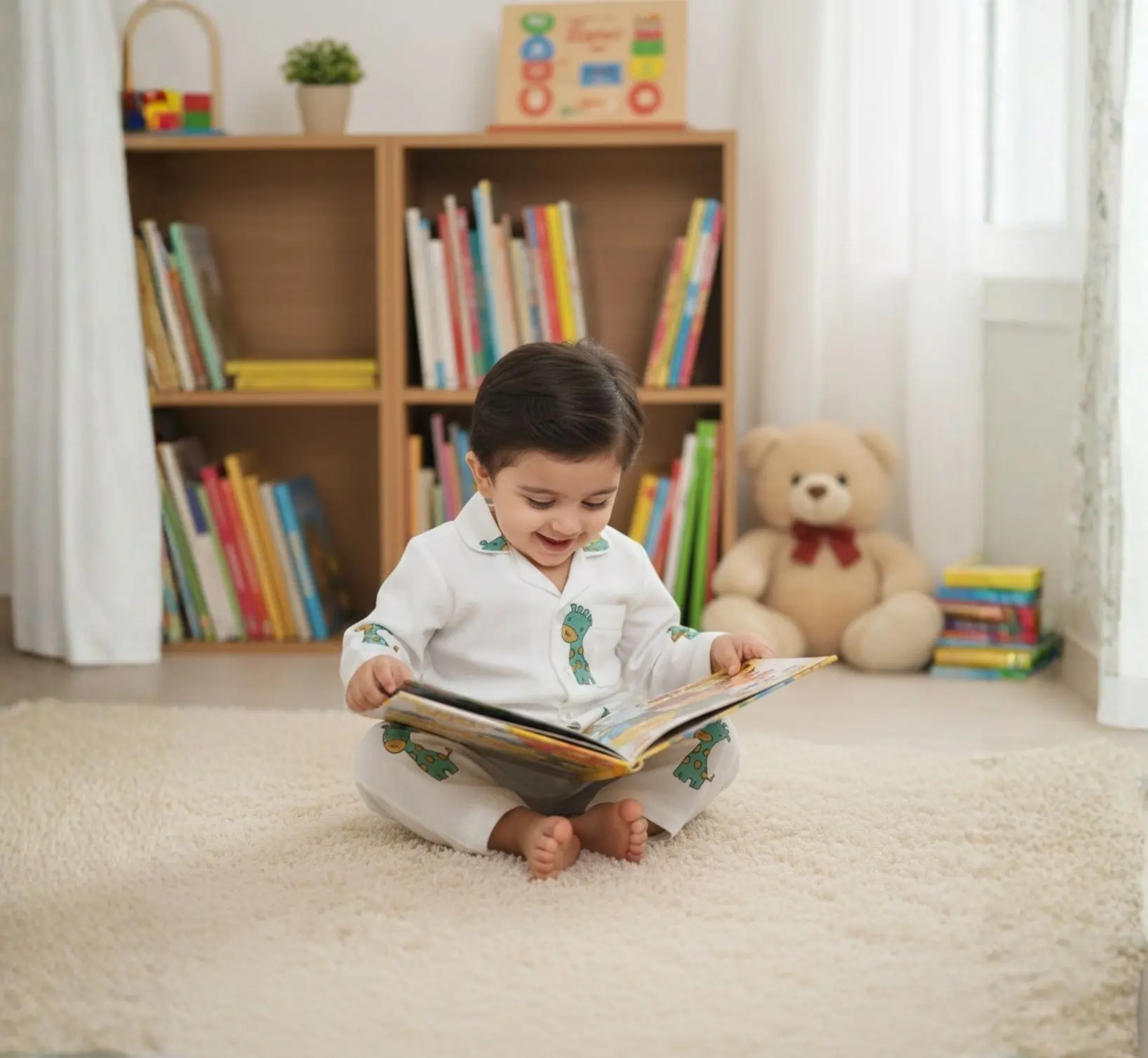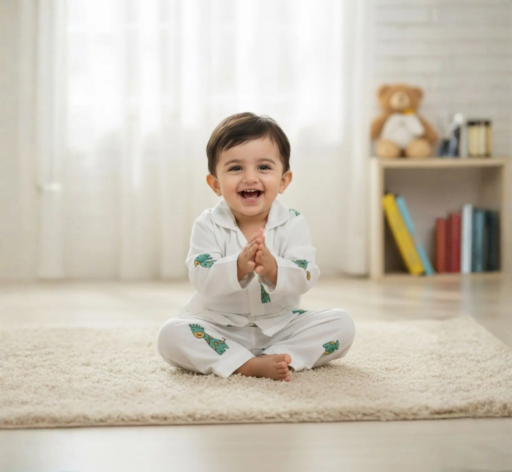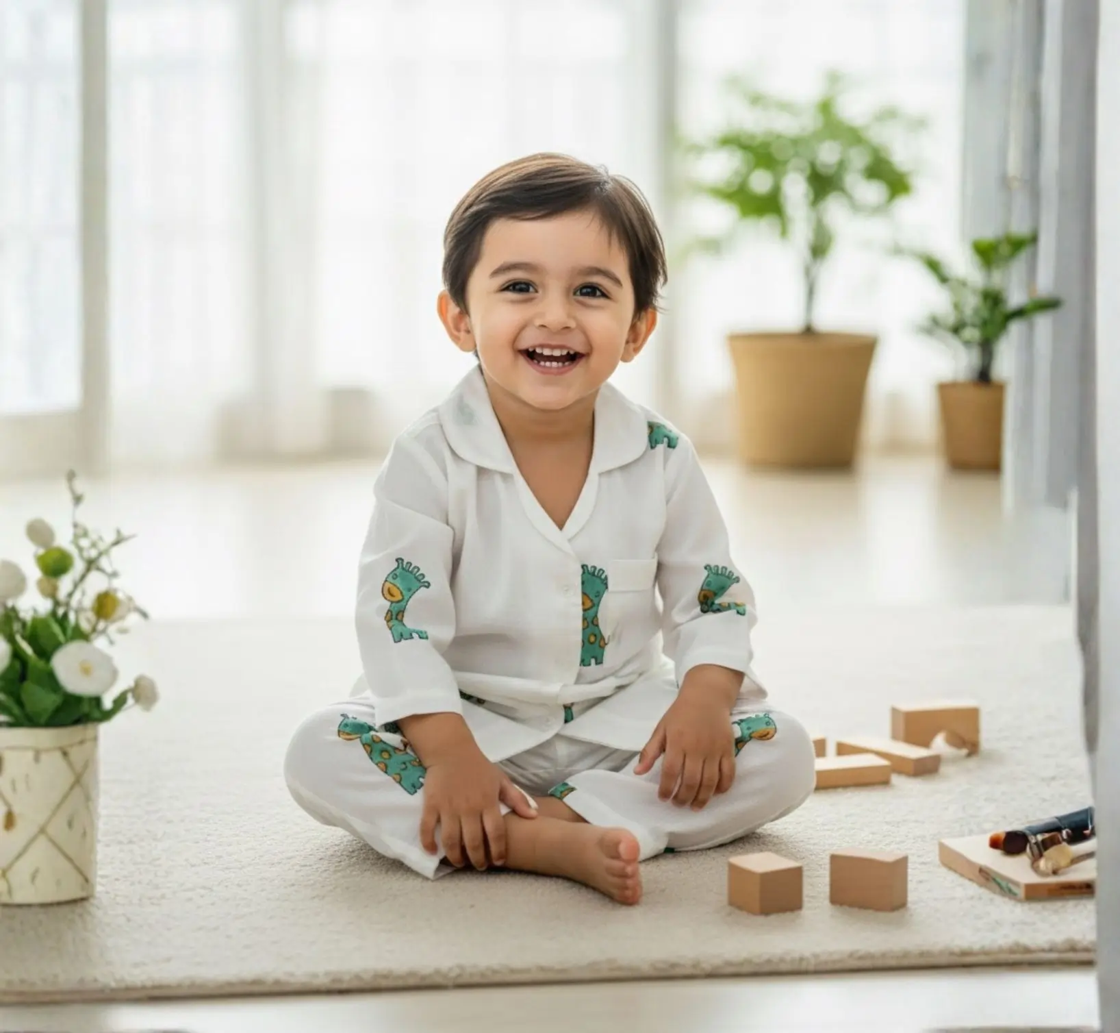 This kids green ziraff night suit is crafted from breathable pure cotton to keep your child comfortable throughout the night. Featuring full sleeves and a charming block print, it is gentle on the skin and ideal for both sleeping and lounging. A cozy everyday nightwear choice for growing kids.