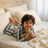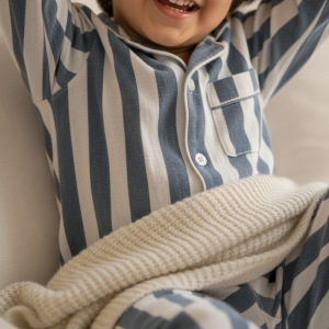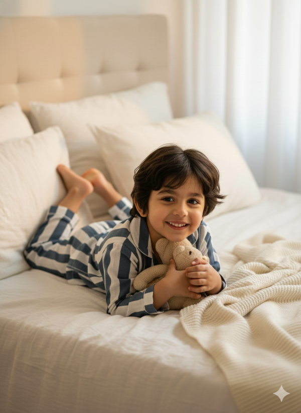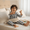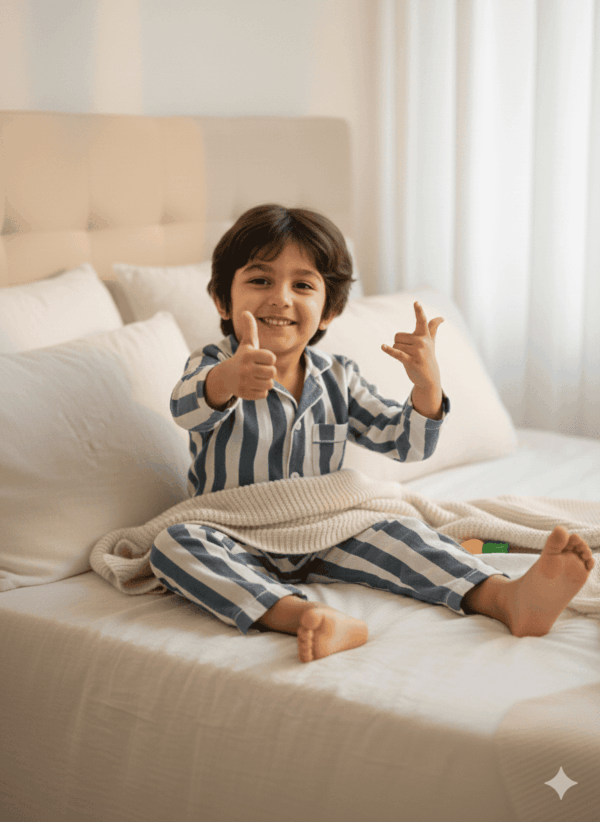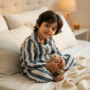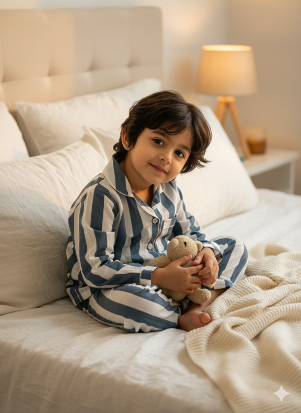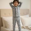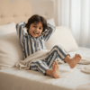 This kids grey stripe night suit is crafted from breathable pure cotton for a soft and comfortable feel. Featuring full sleeves and a clean screen print design, it is gentle on the skin and perfect for everyday sleepwear. A simple and cozy choice for relaxed nights.