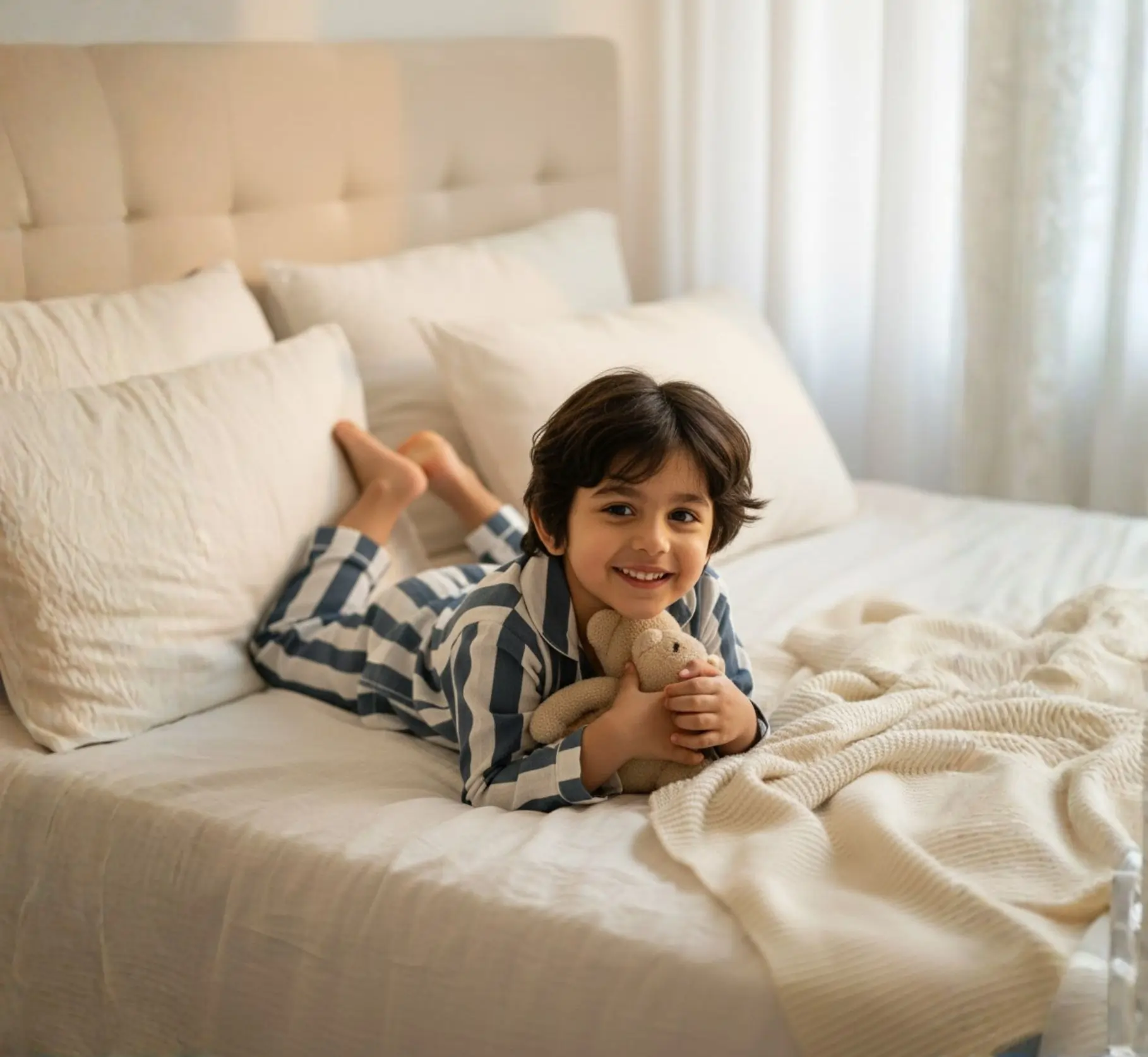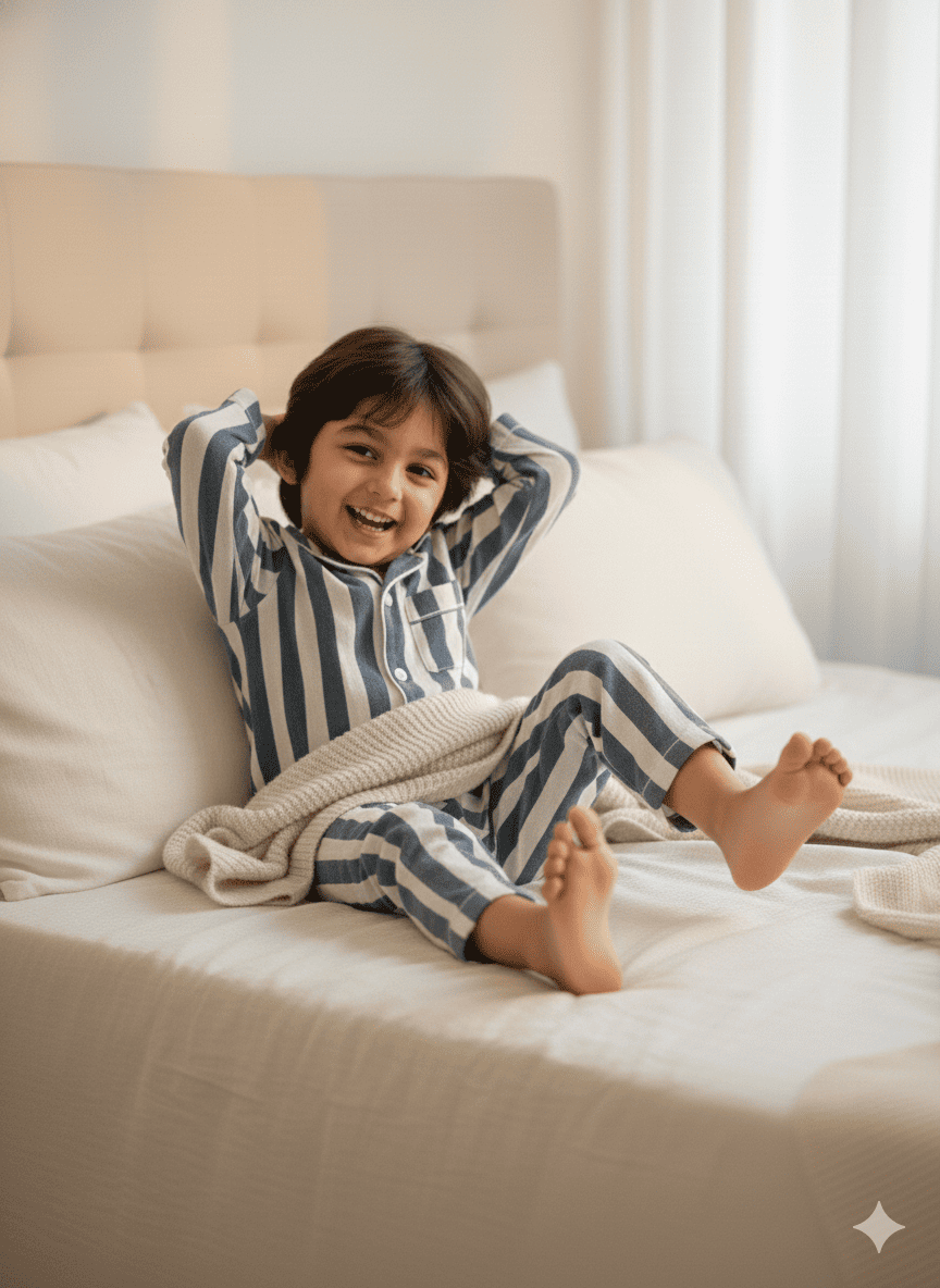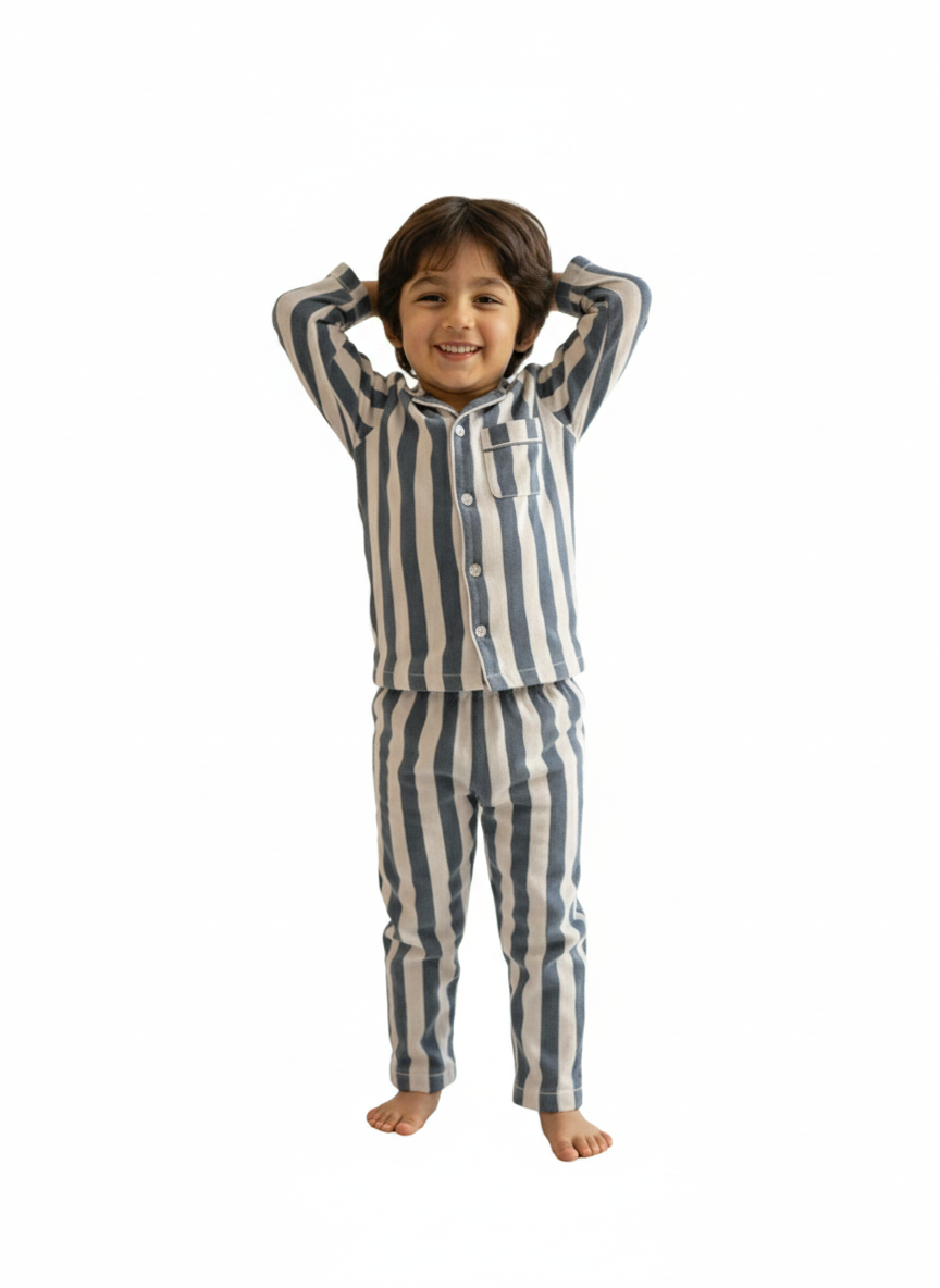 This kids grey stripe night suit is crafted from breathable pure cotton for a soft and comfortable feel. Featuring full sleeves and a clean screen print design, it is gentle on the skin and perfect for everyday sleepwear. A simple and cozy choice for relaxed nights.