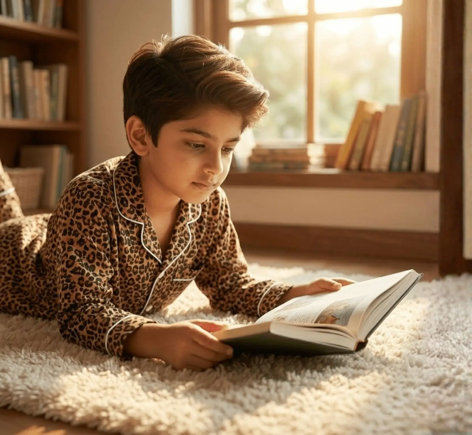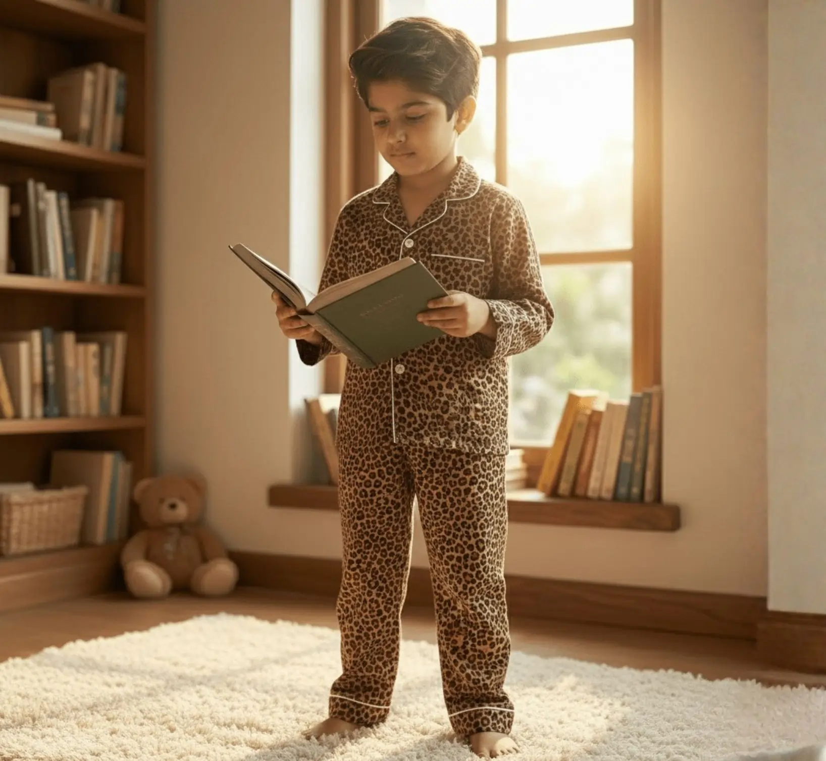 This kids leopard night suit is crafted from pure cotton to provide a soft and breathable feel throughout the night. Featuring full sleeves and a stylish screen print, it is gentle on the skin and perfect for comfortable sleep. An easy, cozy option for everyday nightwear.