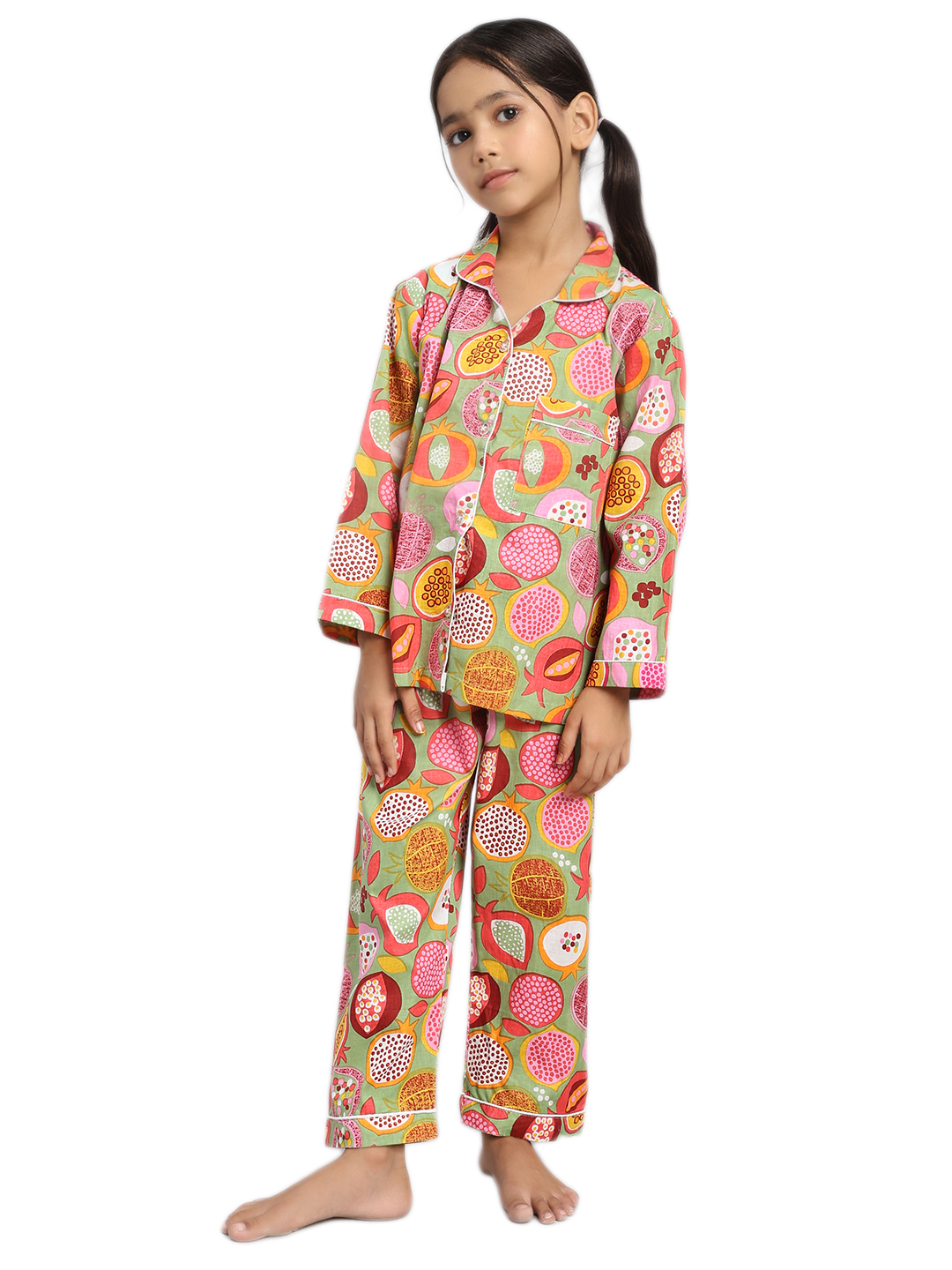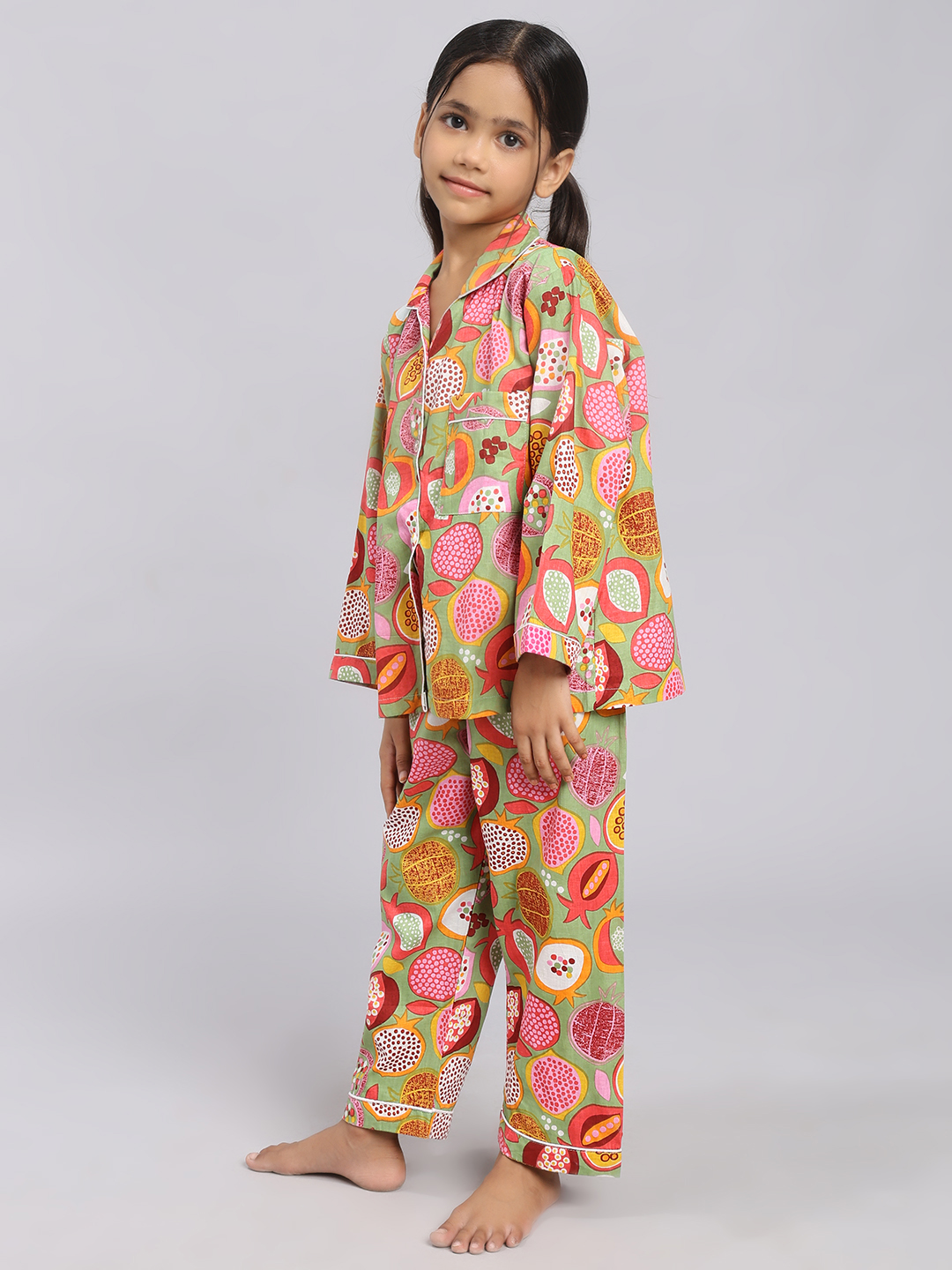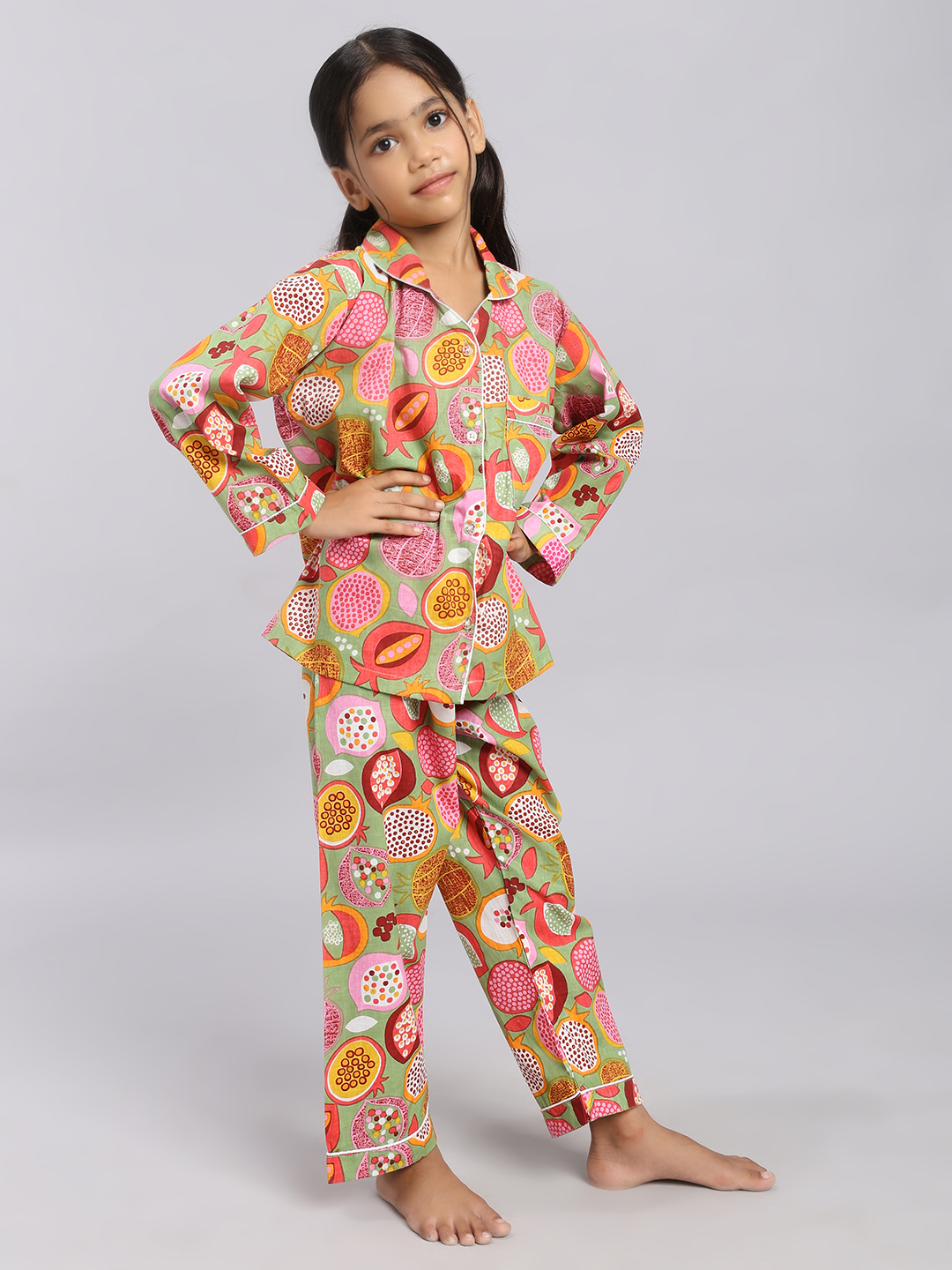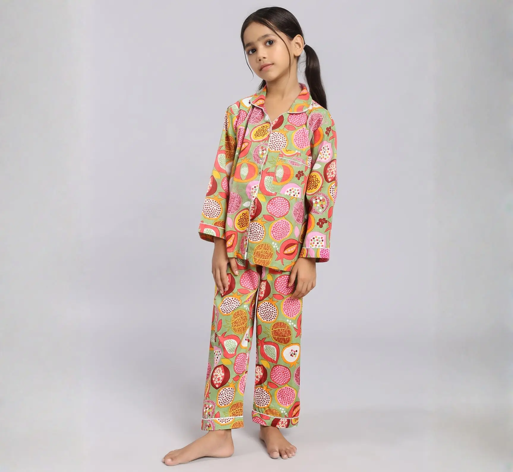 This kids mix fruit print night suit is made from soft pure cotton to ensure a comfortable and breathable feel. Featuring full sleeves and a colorful screen print, it is gentle on the skin and perfect for cozy sleep. A fun and cheerful option for everyday nightwear.
