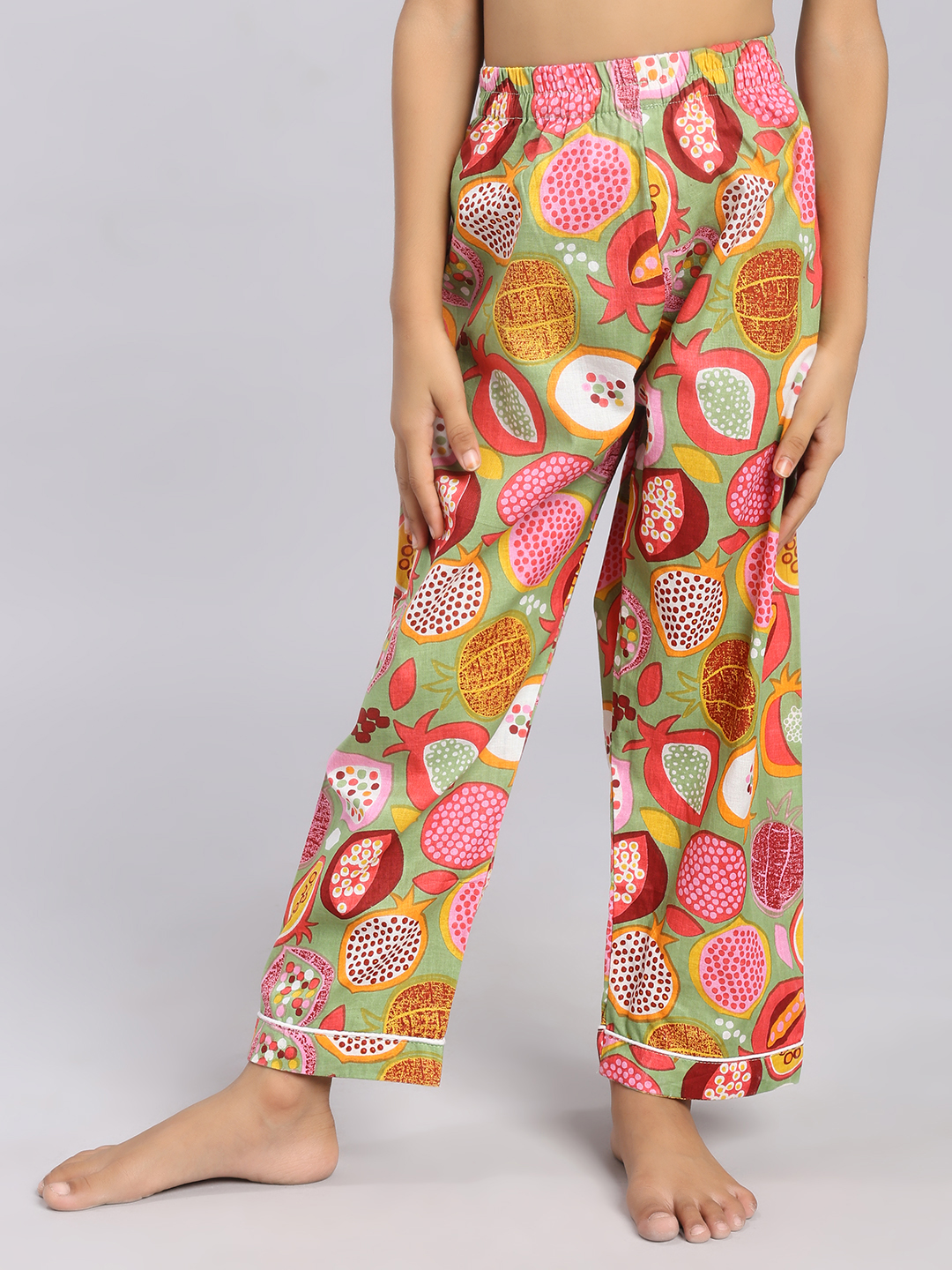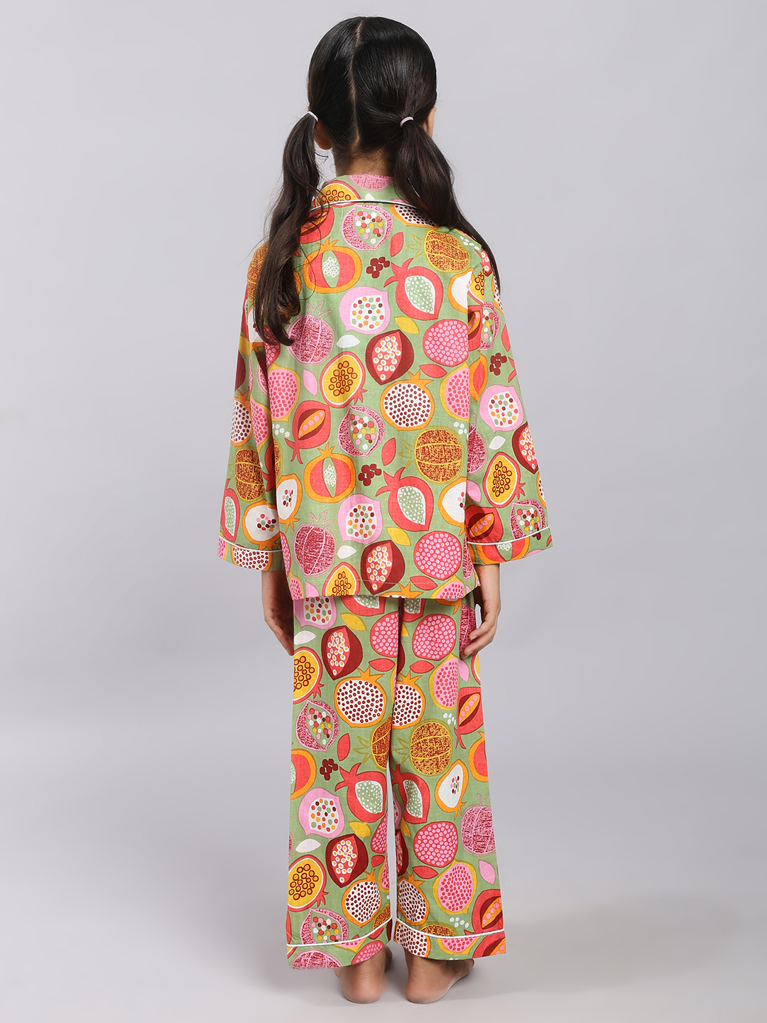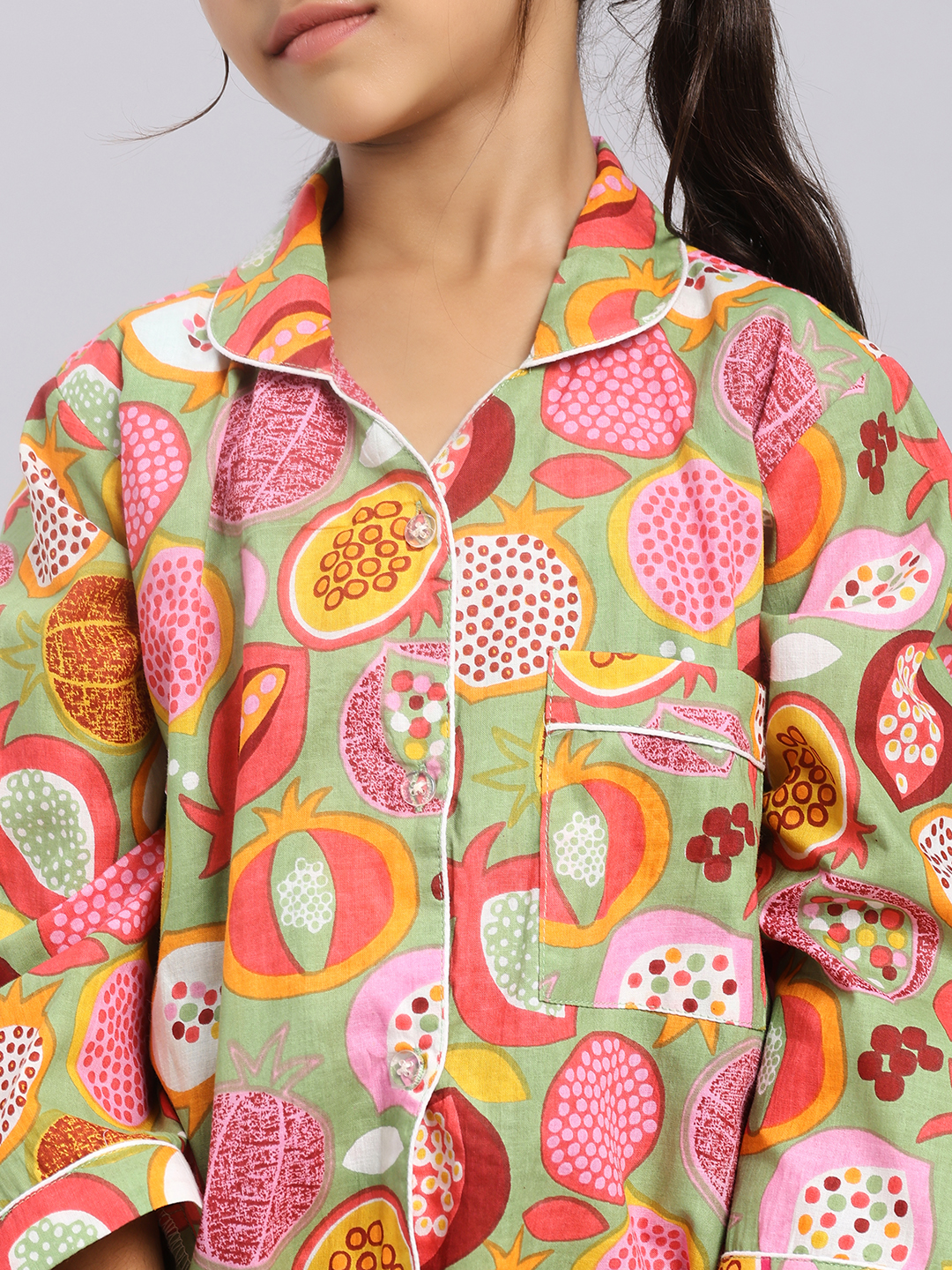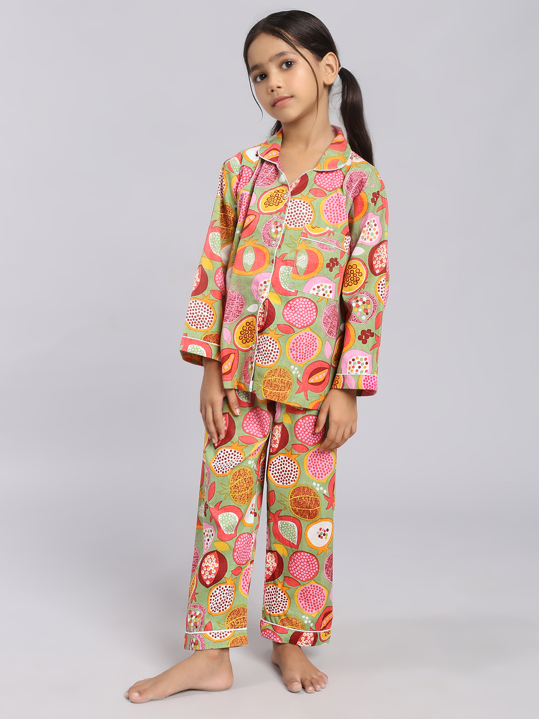 This kids mix fruit print night suit is made from soft pure cotton to ensure a comfortable and breathable feel. Featuring full sleeves and a colorful screen print, it is gentle on the skin and perfect for cozy sleep. A fun and cheerful option for everyday nightwear.