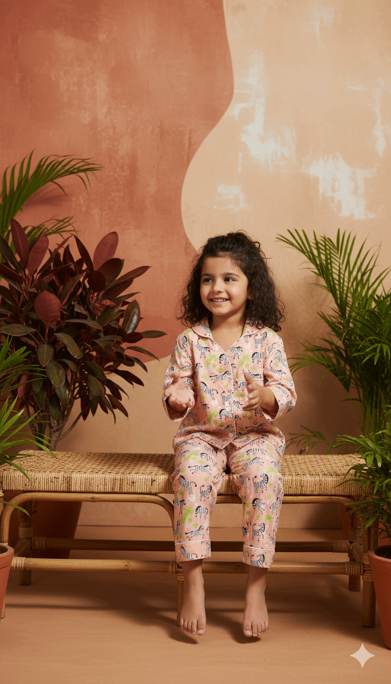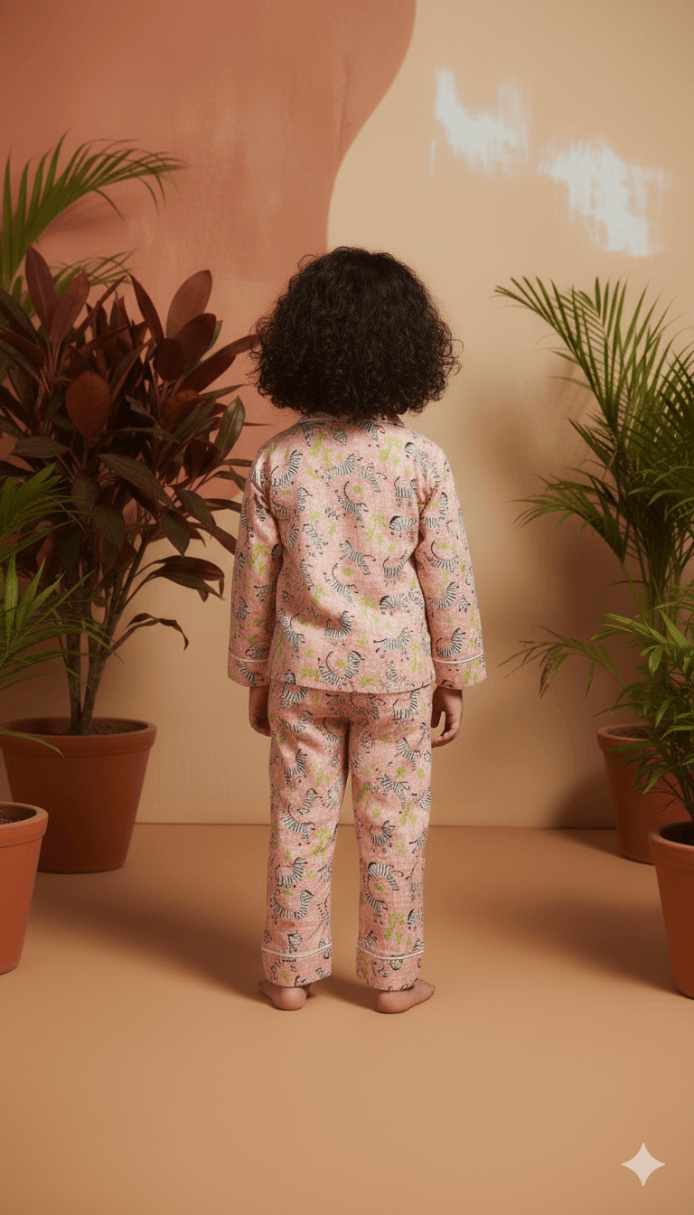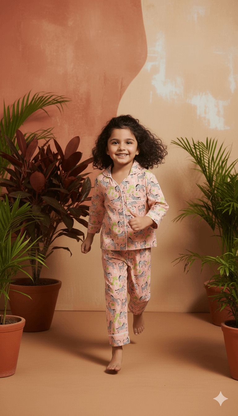 This kids pink zebra night suit is made from soft and breathable pure cotton for all-night comfort. Featuring full sleeves and a playful screen print, it feels gentle on the skin and allows easy movement. A cozy and cheerful choice for everyday bedtime wear.