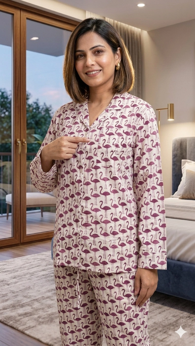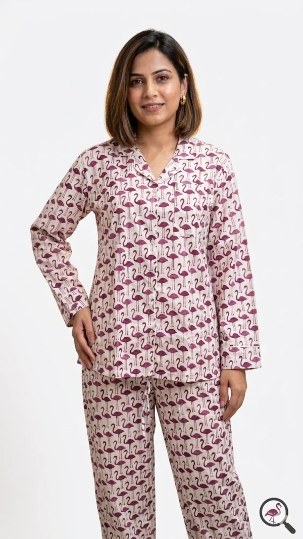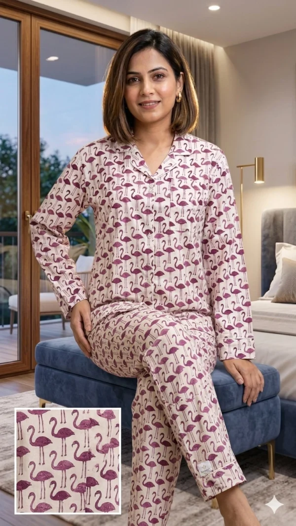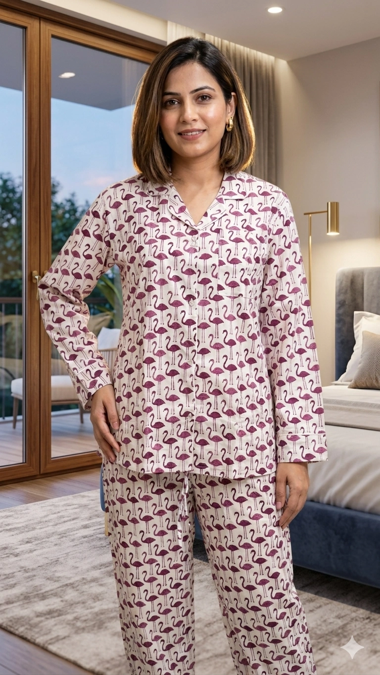 Embrace comfort and charm with this delightful Flamingo-print cotton night suit, designed to keep you cozy all night long. This full-sleeve women’s night suit is available in sizes S to XXL for a relaxed and perfect fit.