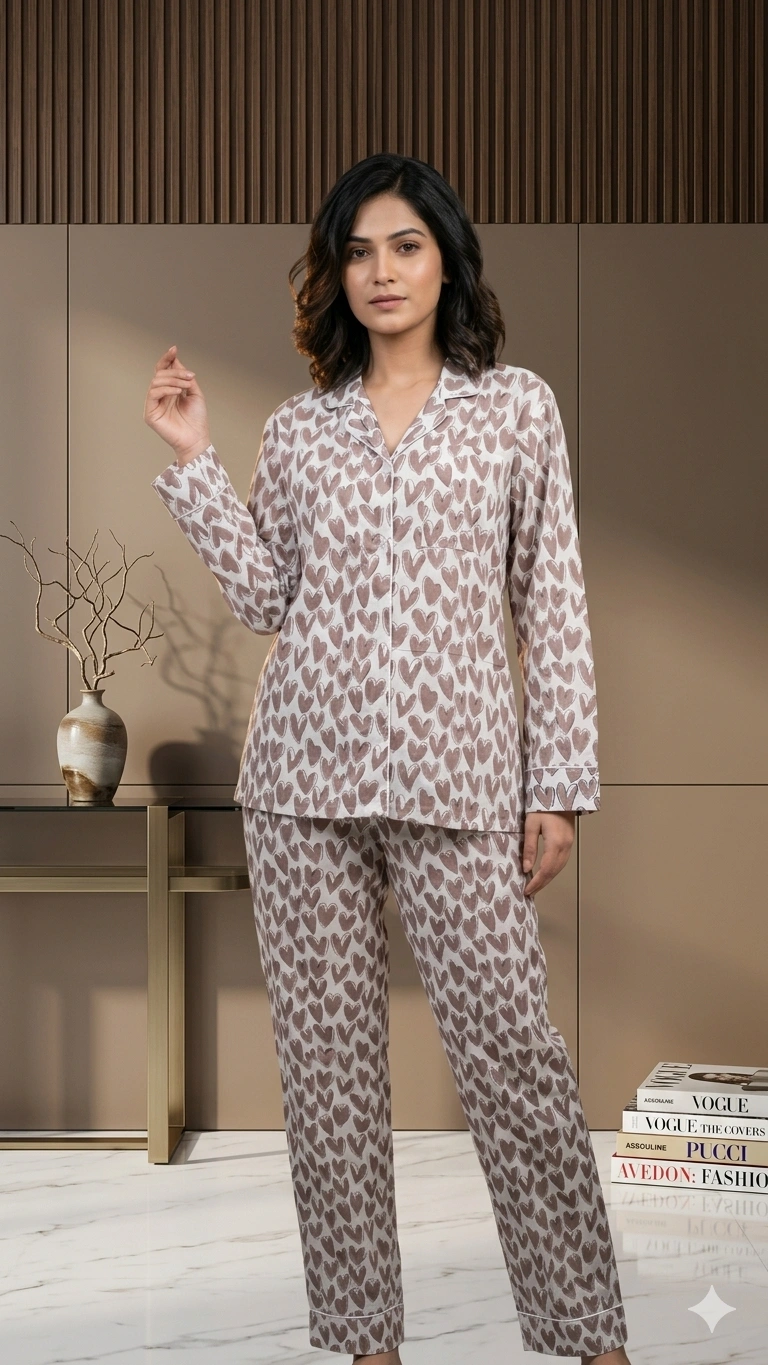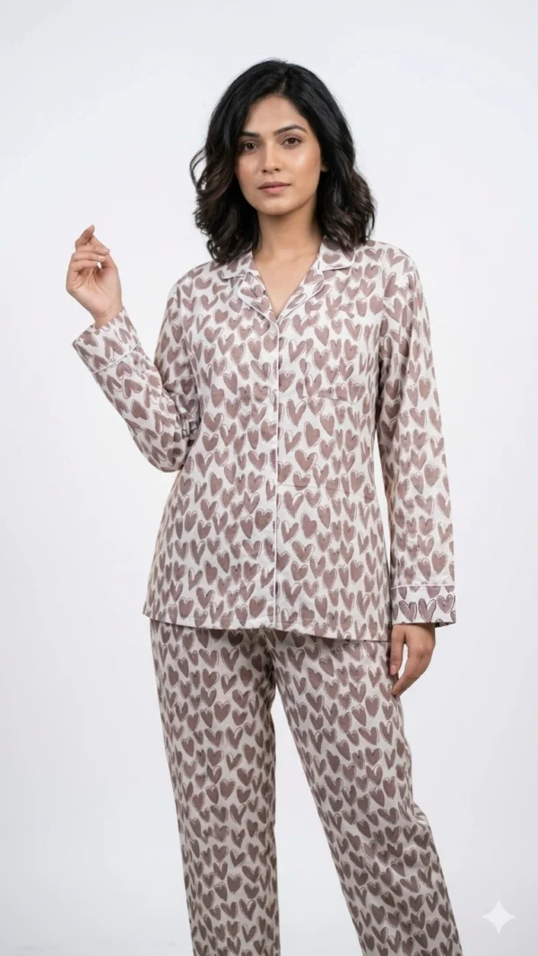 Fall in love with comfort in this sweet Heart-print cotton night suit, perfect for a peaceful night's sleep. This full-sleeve women's night suit is available in sizes S to XXL for a cozy and perfect fit.